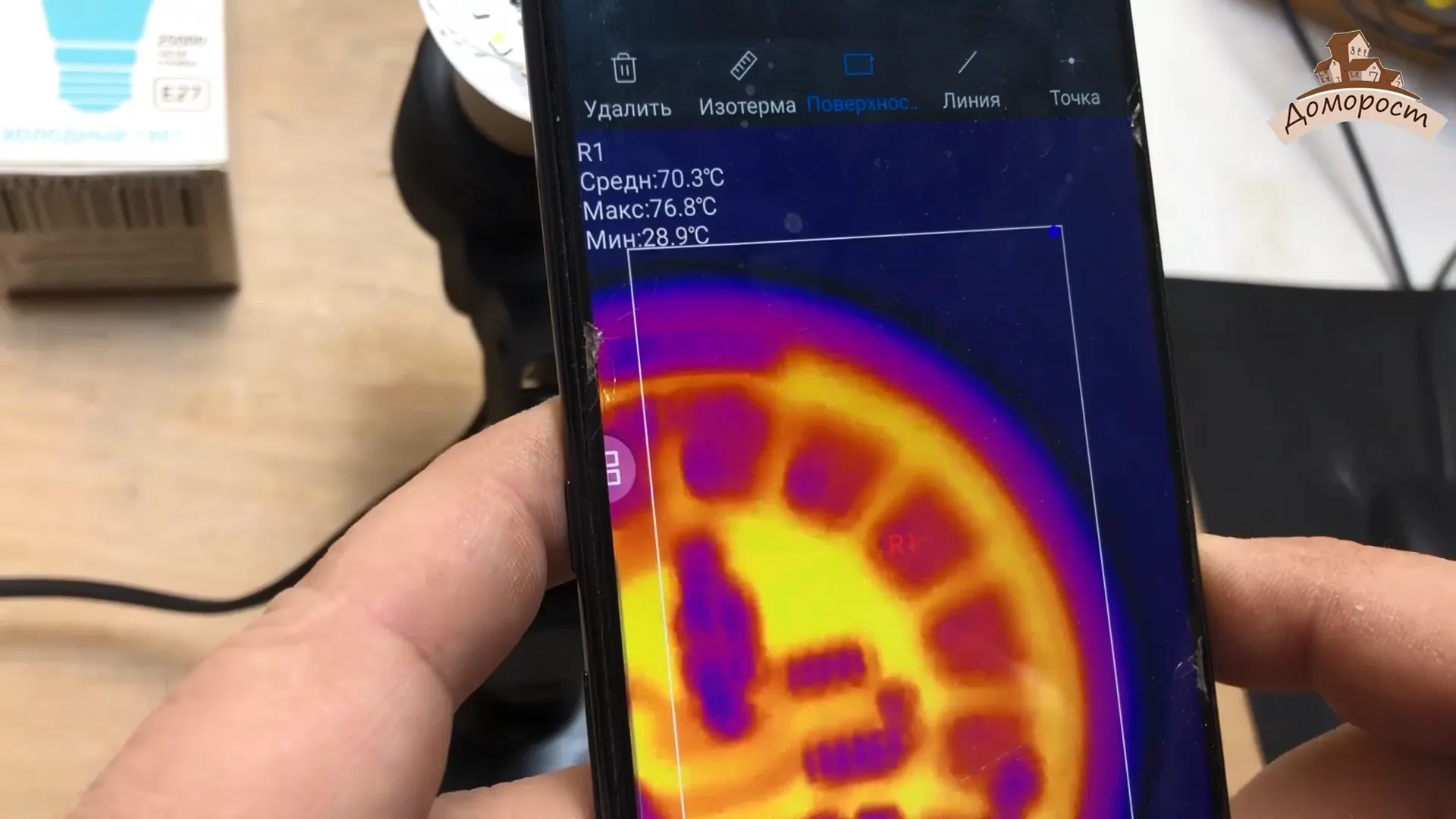 Чтобы измерить температуру на диодной плате, находим самую горячую точку на плате и подключаем к ней термопару. Включаем лампу и даем ей прогреться в течение получаса, чтобы увидеть, как изменится температура. После получаса работы температура на диодной плате достигает 82 градусов Цельсия, что является допустимой температурой для работы светодиодов.