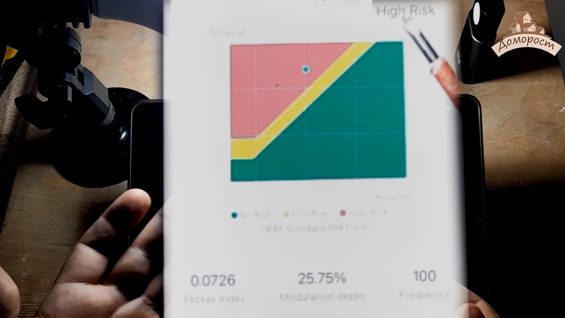 В результате было выявлено, что качество света этой лампы низкое, так как она имеет большое положительное смещение в желто-зеленый цветовой оттенок и большие пульсации света, что может быть опасным для здоровья глаз. На диаграмме оценки риска было показано, что использование этой лампы может представлять серьезный риск для здоровья, и ее лучше не использовать в местах, где проводится много времени.