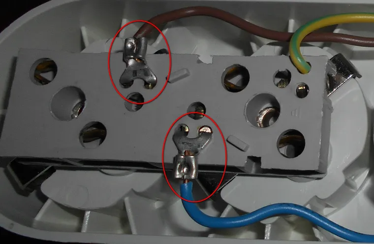 Провод поджимается квадратной гайкой . Чтобы зажать нормально провод нужно использовать оба отверстия для проводов. В противном случае гайка перекашивается и провод после затяжки винтом можно вытянуть при желании . После установки "U" образных клемм проблема была решена.