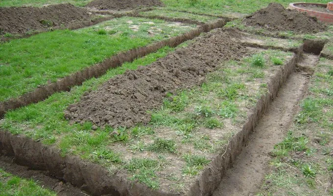 Внимание, не готовьте сильно заранее землю под фундамент. Рекомендуется, чтобы непосредственно перед заливкой земля еще была чуть влажная. Также это поможет вам избежать проблем связанных с тем, что сухая земля будет падать в подготовленные траншеи.
