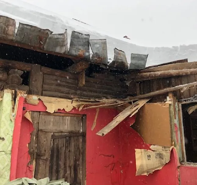 На стыке кровли основного сруда и веранды были подложены листы кровельного железа. Это они сейчас загнуты вверх.