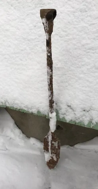 Удивительный инструмент был найден под полом . Что это? Металлическая вот такая штуковина. На конце что то такое по форме вроде здоровенного наконечника копья … странной и непонятной формы что то …. Этот наконечник плавно переходит в металлический стержень …как лом … На верхнем конце инструмента кольцо … Отверстие такое, что туда, например, удобно войдет деревянный черенок лопаты … Тогда получится что то такое, что удобно будет крутить … Может можно было вручную бурить дырки в земле этой штукой ? Непонятно.
