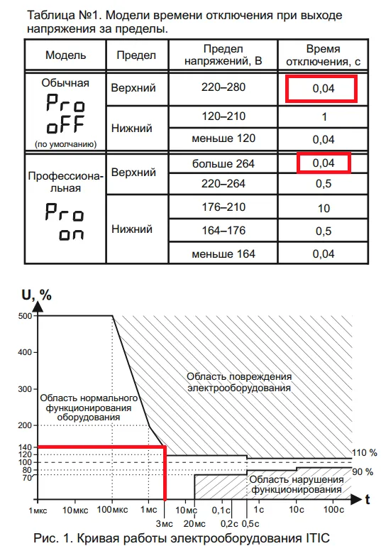 Время отключения при превышении напряжения выше 264 Вольт составляет 40 мС (миллисекунд). При этом не указано, время отключения НЕ БОЛЕЕ или НЕ МЕНЕЕ 40 мС. Это очень важно...