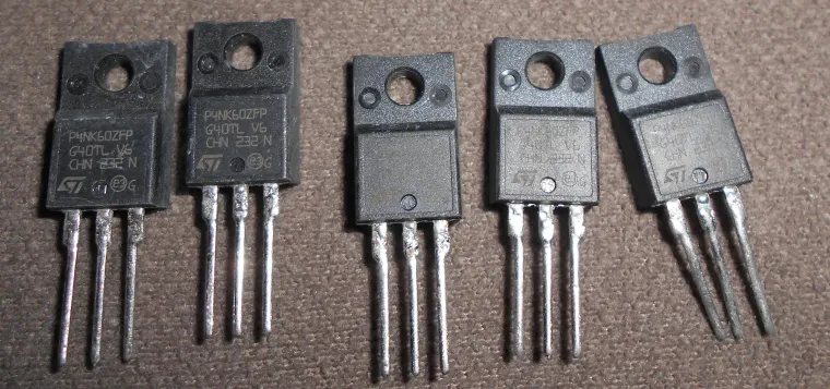 Это новые мосфеты с каплями припоя на выводах . Пластиковый корпус с облоем , а обратная сторона выводов вогнутая с рваными краями. Я первый раз встречаю транзисторы в таком виде . Есть все основания предполагать , что это подделка и к ST Microelectronics отношения не имеет .