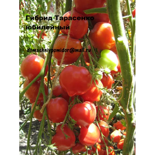 ЮБИЛЕЙНЫЙ ТАРАСЕНКО. Этот сорт был выведен Феодосием Макаровичем в 1987 году как раз к 75 летию, отсюда и название. Этот сорт из высокорослых. Его главный стебель вырастает до 3 метров, слабооблиственный. На главном стебле к концу сезона бывают 4 - 5 гроздей. Первая гроздь закладывается над 3 - 4 листом, последующие - через 1 - 2 листа. Иногда вторая гроздь образуется вслед за первой. Сложные соцветия несут 300 и больше цветков, но завязи на них образуются не одновременно и не на всех. Первые завязи появляются в основании, потом в центре соцветия, а затем постепенно проходит завязывание плодов и на периферии. Плоды округлые, некоторые плоскоокруглые, разные по размеру. Вес помидора 180 - 200 г, у крупных в области чашечки имеется незначительная ребристость, верхушка их чуть-чуть оттянута. Плоды эти оранжево-красного цвета, гладкие, мясистые, 6 - 8-камерные, хороших вкусовых качеств. Они пригодны для употребления в свежем виде, хороши в салатах, используют их и для заготовки впрок.. Свои товарные качества сохраняют в течение одного - полутора месяцев. Первые грозди Юбилейного достигают 4 - 4,5 кг.