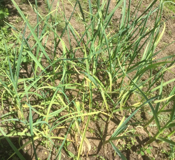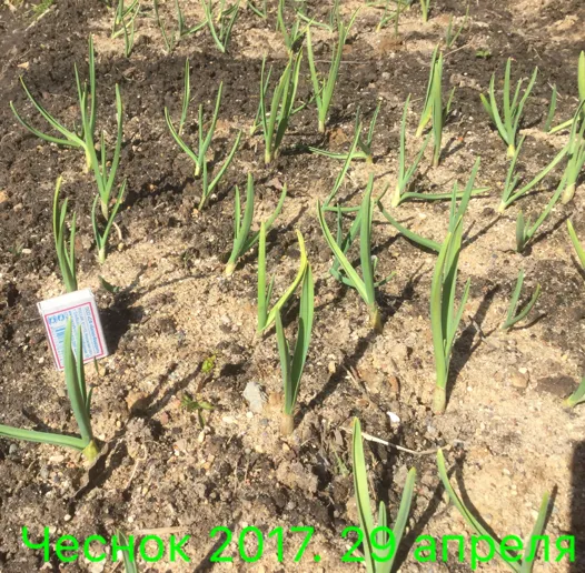 У него явно пожелтели листочки, правда не у всех растений. Сказывается то, что были высажены очень разные сорта. Пока лидируют по росту и крепости свой домашний чеснок. Все растения подкормила сульфатом калия. Вот теперь жду какова будет реакция на подкормку. Растворила удобрение в воде и и поливала по листьям. Вроде как внекорневая подкормка.