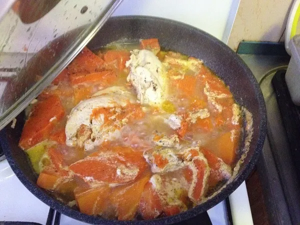 Отчистила от косточек и кожуры.Порезала и положила в сковородку с куриными грудками.