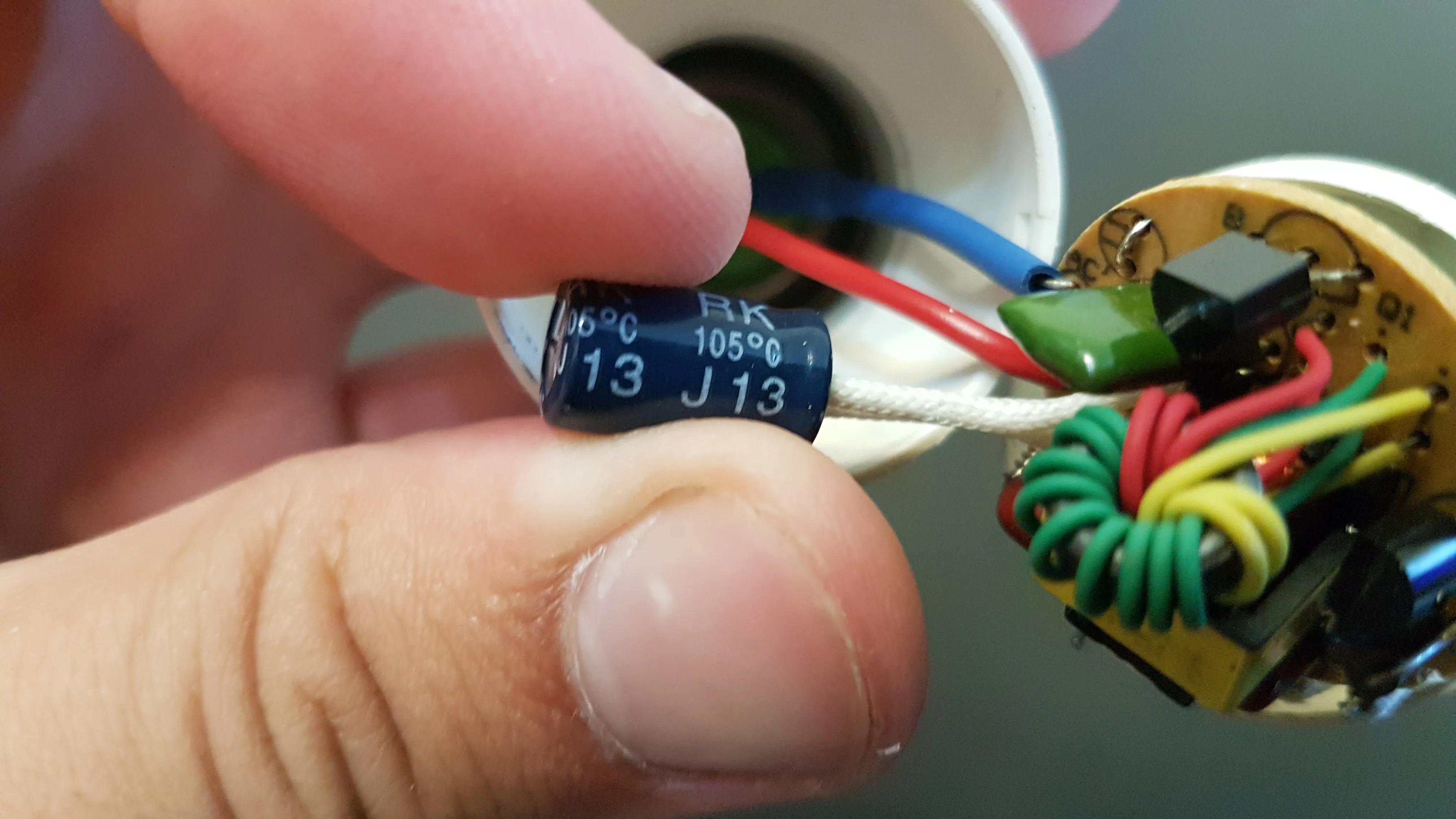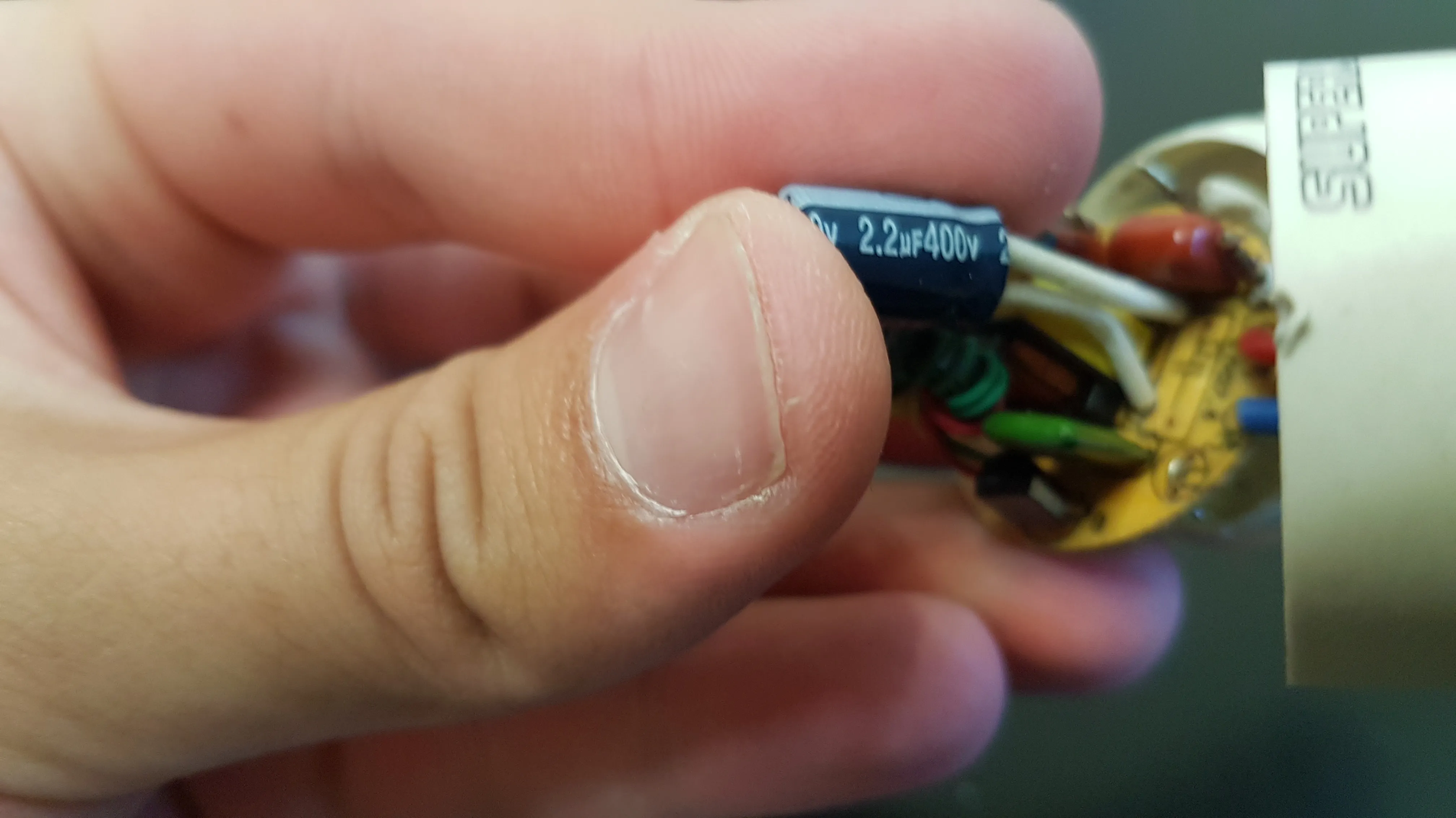 А и искать не нужно, пайка электролитического конденсатора с кольцевой трещиной и там явно нету никакого контакта, вероятно, лампа какое то время работала без конденсатора:)