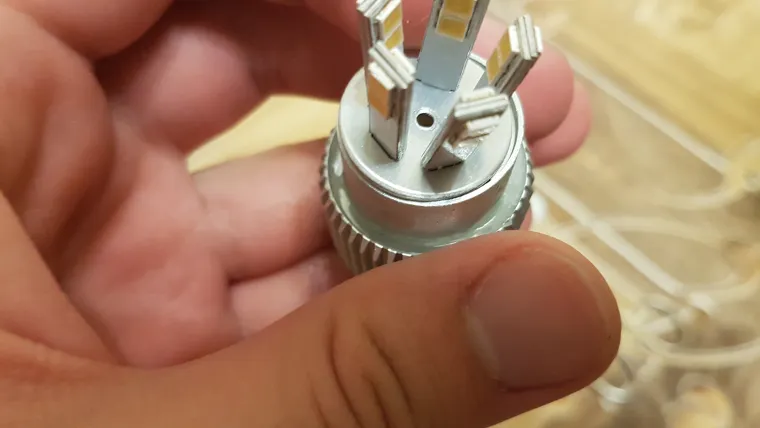 Ладно, приступим к извлечению драйвера из лампы, для этого открутим диодную плату и нижнюю пластиковую часть с цоколем. Кстати в этой лампе не было брака в отличии от первой, и контакт платы с "лепестками" с радиатором хороший, не хватает только термопасты.