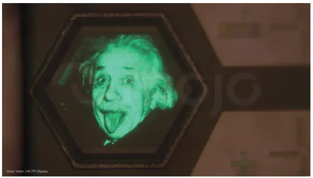 Когда заходит разговор о микросветодиодах и о MicroLED технологиях, первое, что всем приходит в голову это смартфоны, кино- фото- техника, дисплеи . Но прорывные движения удаются тем, кто умеет смотреть не так как все. Большой опыт разработок и особенности MicroLED технологий, такие как, микроскопические светодиоды , самоизлучение, низкое энергопортебление, идеальный черный и отличная цветовая гамма,возможность создания гибких экранов MicroLED, подтолкнули американскую компанию Mojo Vision на стартап - создание контактной линзы Mojo Lens . Mojo Lens, прежде всего, должна будет помогать людям с нарушениями зрения, в том числе и с возрастными нарушениями. Если Mojo Lens будет создана так, как это задумано сейчас, то проблемы слабого зрения, которые сейчас решаются только хирургическим вмешательством, будет можно решить, используя эти контактные линзы с встроенным дисплеем MicroLED. Крохотный MicroLED дисплей контактной линзы должен в реальном времени создать улучшенное изображение реальной действительности, которое будет направлено и спроецировано точно в нужную область сетчатки глаза. Чтобы сегодня, хоть как то представить себе это будущее, посмотрите на фотографию крохотного, размером с песчинку, MicroLED дисплея на котором отлично видно знаменитое изображение Альберта Энштейна :