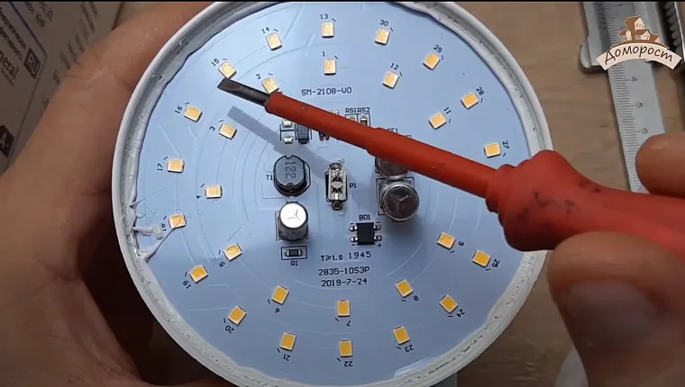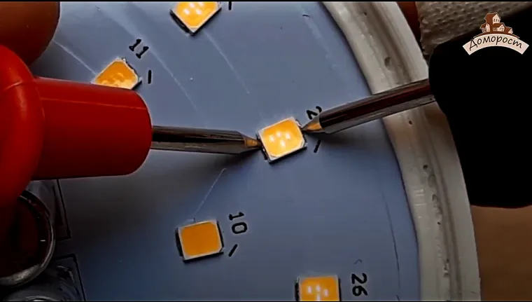 12,61 Вольт многовато , получается светодиоды четырехкристальные на 12 Вольт каждый . Ток можно измерить на любом светодиоде , как я стрелками показал . При подключении прибора три светодиода погаснут , а прибор покажет ток через светодиоды. Сколько на лампе написано (мощность 40 Вт) ? Бывают такие светодиоды , как на картинке ниже.