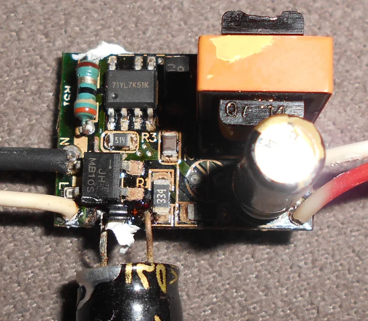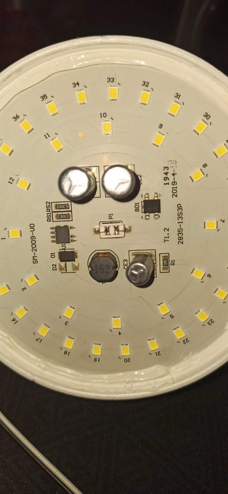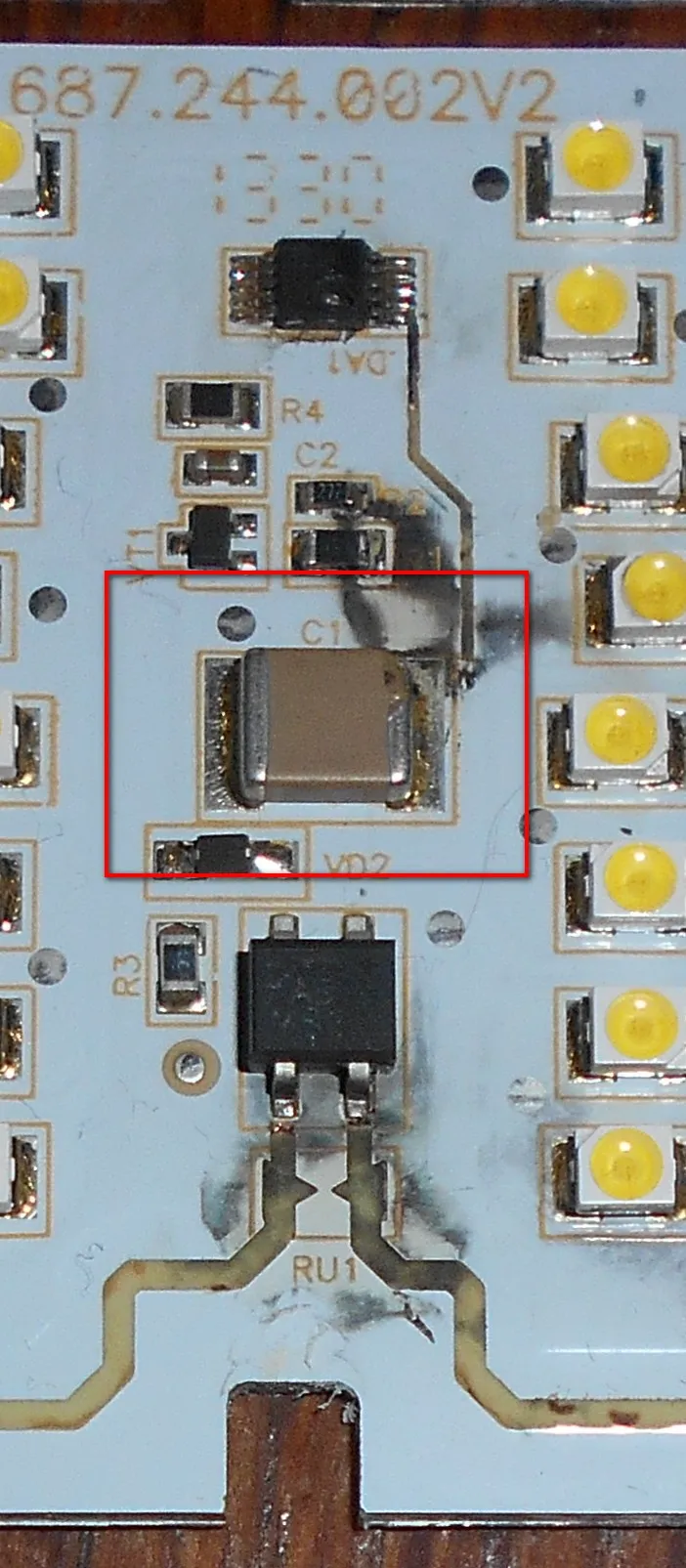 Еще я бы не исключал микротрещины в пайках . После хорошего прогрева где - то "пропадает" контакт и лампа гаснет. Ранее я так попался , когда у меня разнесло в светильнике микросхему стабилизации тока при включении стиральной машины . Дело было в плохой пайке SMD конденсатора 100nF*400v после диодного моста. А без него нельзя эксплуатировать светильник. У меня не сходилось почему в светильнике три одинаковые платы , а одна вообще никак не пострадала от броска напряжения в сети. Ранее я это тоже описывал :