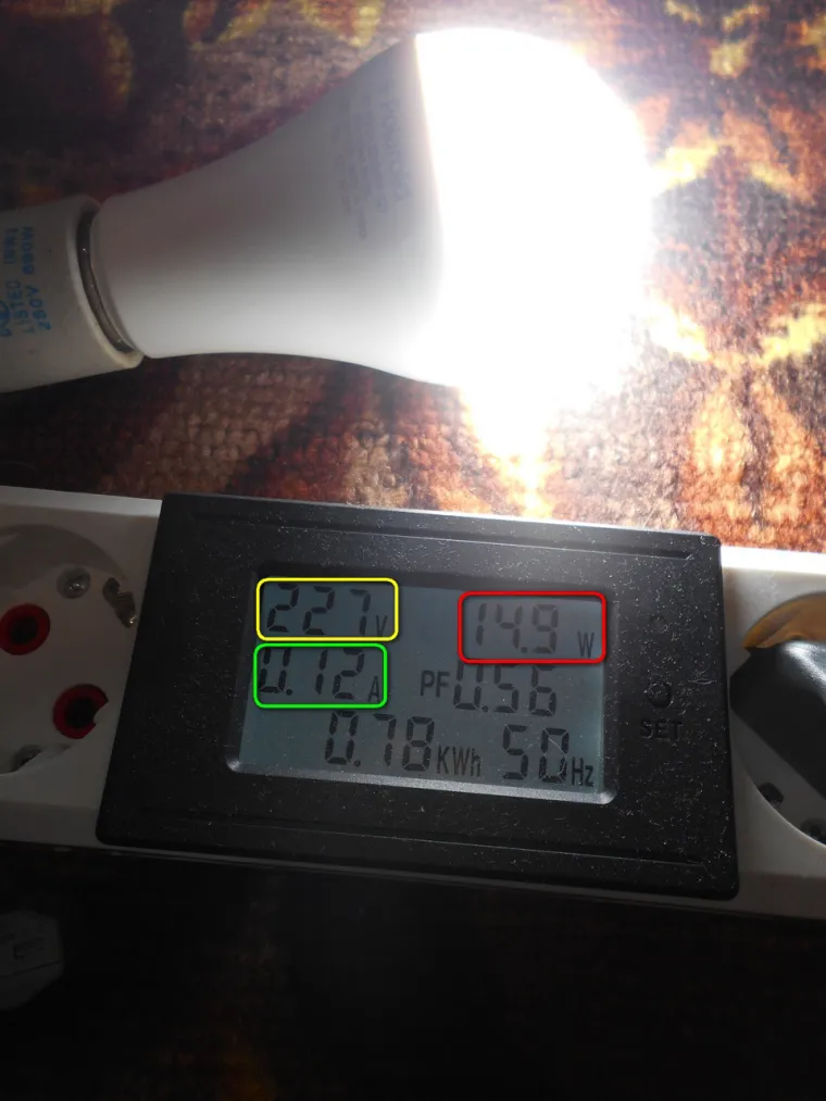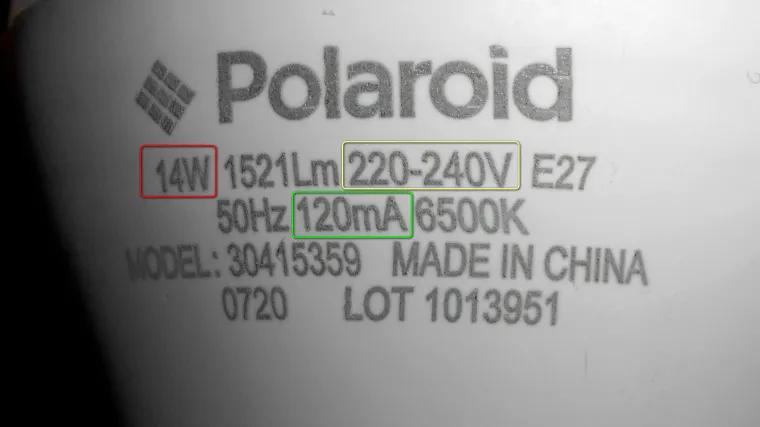Решил перепроверить свой ваттметр . Китайцы заявили точность показаний 1%. Заодно и проверим маркировки Polaroid в корпусе А65. Драйвер в лампе линейный