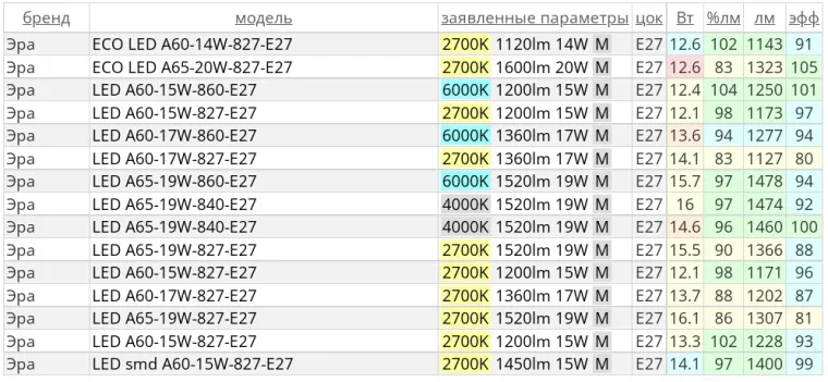 Уже даже и не знаю. Но завышенные цифры кажутся сомнительными... Некоторое время назад, на этом сайте, довольно широко критиковали результаты "ЛампТест". Так вот, по сравнению со @Светотехника, результаты, опубликованные на "ЛампТест" выглядят достаточно достоверными... Простой пример... Смотрим видео: "Что внутри Эра 15Вт E27" (https://www.youtube.com/watch?v=TWL9nKM-PSQ) из которого мы узнаем, что вместо заявленных 1200 Люмен, лампочка, оказывается, выдает целых 1523 Люмен... Превышение на 26,9%. И там опять же косяк с измерением температуры стеклотекстолита... Далее смотрим результаты "ЛампТест", заходим в каталог, выбираем "ЭРА", убираем, лишнее из таблицы и видим следующее: в лучшем случае, лампочка отдает порядка 100% от заявленного потока, а еще чаще порядка 85-90%. Вопрос в том, какой производитель будет дарить лишние люмены, которые не заявлены на коробке?!