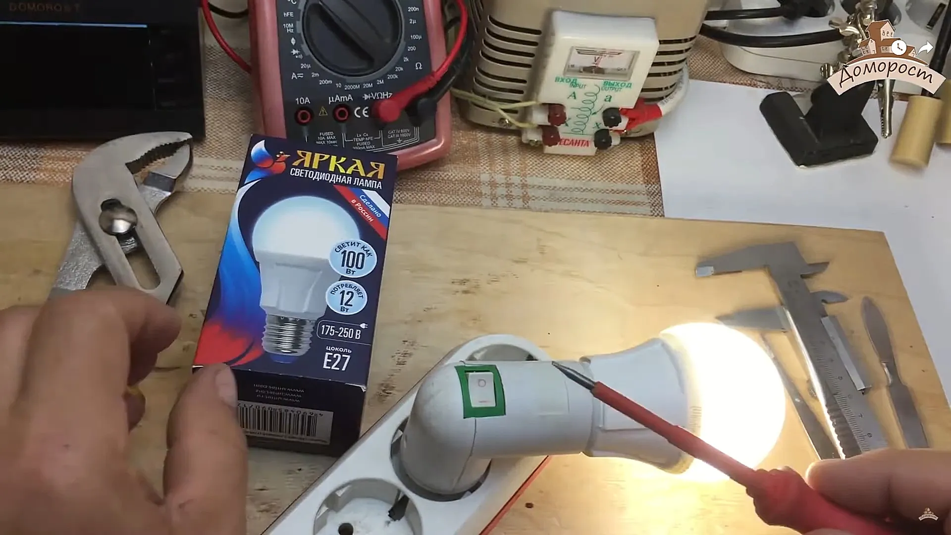 При включении мы видим потребляемую лампой мощность 9,8 Вт. Как-то совсем не 12 Вт, но для такого корпуса это даже лучше .