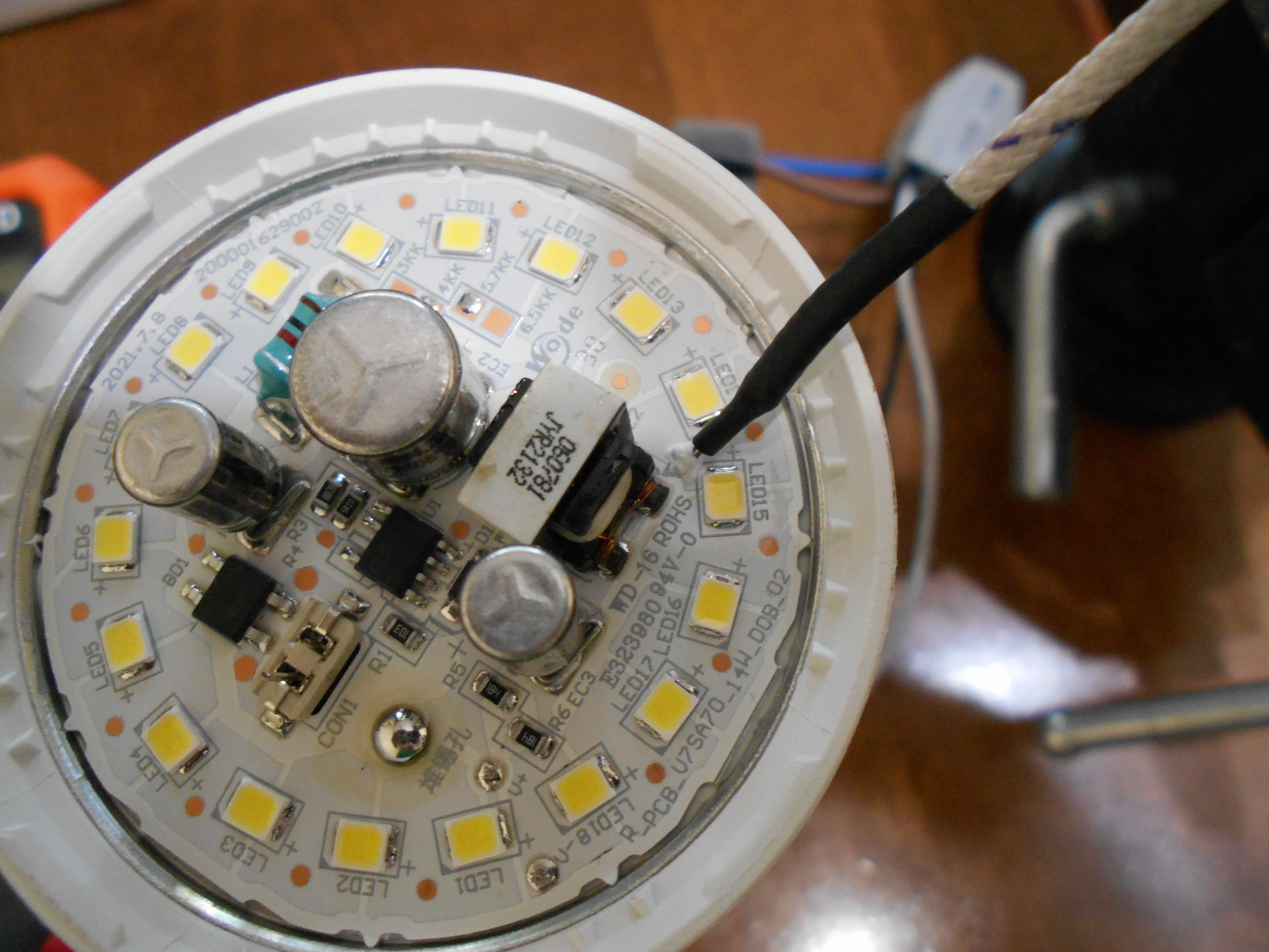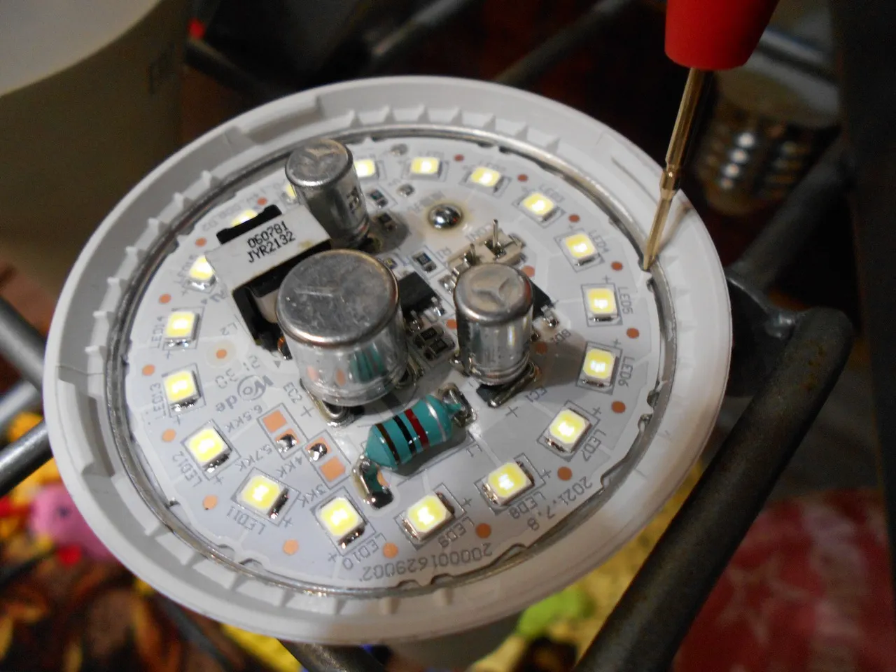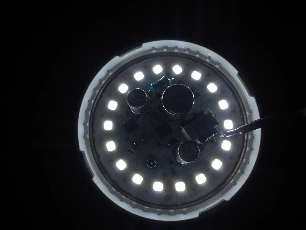 Сегодня будем исследовать температуру алюминиевой платы в лампе с габаритными размерами ⌀70хH128 мм. Заявленная мощность лампы 14 Вт, заявленный световой поток 1400 Лм. Под рассеивателем 18 светодиодов соединены последовательно .