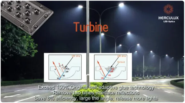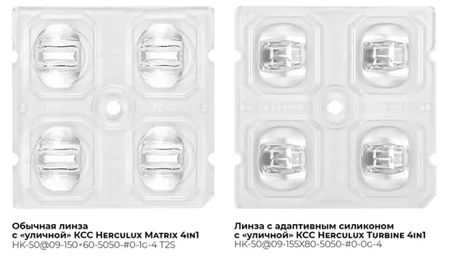 Меняет ситуацию линза Herculux Turbine от компании Chengdu HercuLux Photoelectric Technology . Групповая линза с адаптивным силиконом, производства HercuLux совсем недавно появилась на российском рынке. Пока компания «Трион» предлагает единственную модификацию «уличной» линзы “4 in 1” формата 2х2, линзу из поликарбоната, размером 50х50мм. Herculux Turbine 4 in 1 с адаптивным силиконом позиционируется как линза с КПД более 100%, имея ввиду тот факт, что первые потерянные 4% светового потока на границе люминофор-воздух никогда не учитываются, за 100% всегда принимается световой поток светодиода уже с учетом этих потерь.