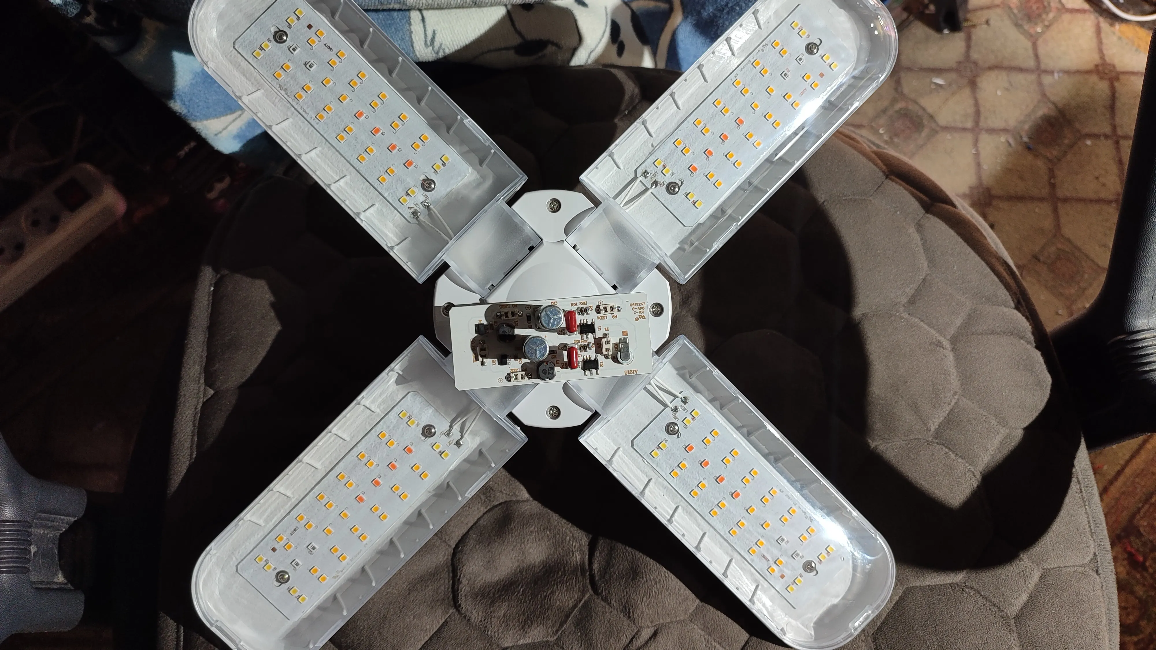 по 1й лампе от эры - набор то светодиодов хороший, но драйвер в этой, и не только, от эры, никудышний. небольшие колебания входного напряжения, 2-3-5 вольт приводят к заметным провалам в яркости. да на паялке включение и работа фена сразу приводит к мерцанию этих ламп, что на 4 лепестка, что на два. у аналогичных ламп от минифермера такого безобразия ни разу не видел. в итоге надоело, выкусил эту плату и поставил две других платы драйвера, по 2 лепестка на плату, последовательно. и светопредставление исчезло, такое уже делал с 2х лепесковыми лампами от эры.