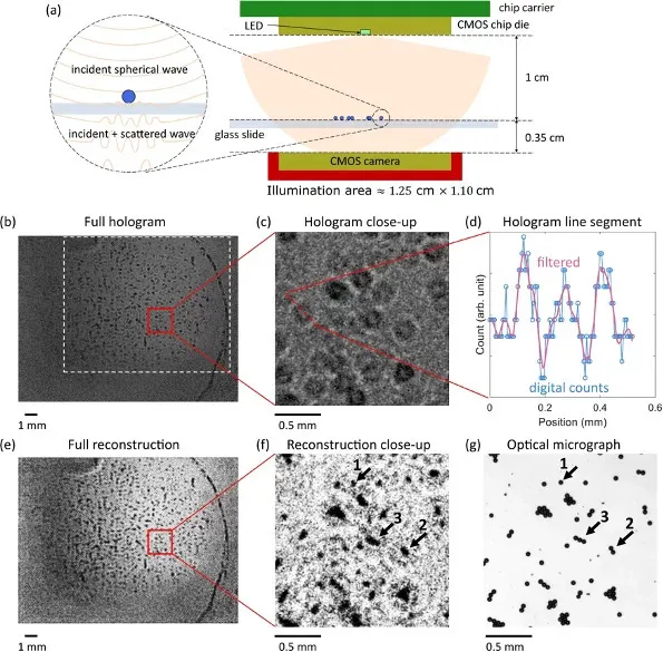 Работа безлинзовых микроскоп проще и быстрее, да и дешевле сборка такого аппарата, так как не нужны точные линзы. Данные собираются благодаря CMOS-датчику, затем полученное изображение формируется в цифровую голограмму. И все это обрабатывает компьютер. Кроме того сегодня ученые задействуют алгоритм нейросетей.