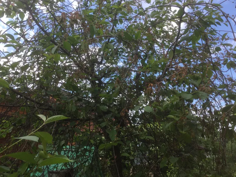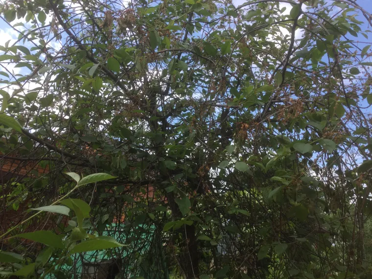 У всех деревьев характерные «обожженные» веточки. Опрыскивать вишню не стала, потому что дождь намечался. Ограничились вырезкой поврежденных веток. Их довольно много. Теперь нужно срочно начинать лечение. Три года назад помог фитолавин (http://domorost.ru/topic/389/биопрепараты-в-помощь-садоводу-и-огороднику-фитолавин). Вот в ближайшие выходные и займусь обработкой. Очень хочется сохранить деревья, уж больно ягода на них вкусная.