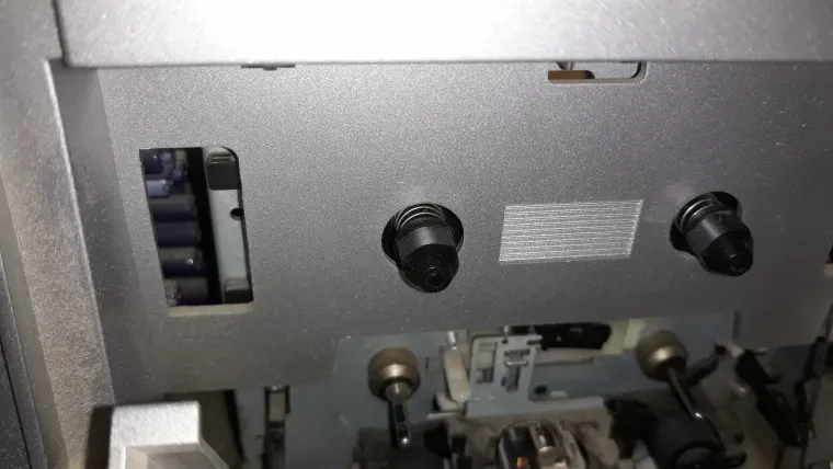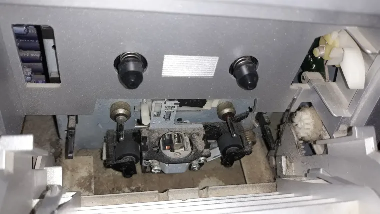 Имеется автореверс, не нужно переворачивать кассету, чтобы послушать другую сторону, естественно имеется возможность записи кассет со всех режимов воспроизведения звука. Кстати через отверстия в кассетнике можно увидеть огромную кучу конденсаторов: