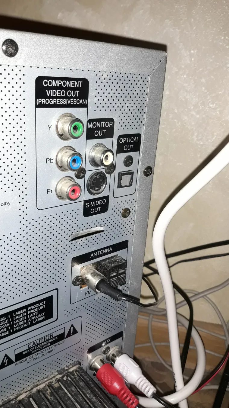 Здесь есть вход AUX, оптический аудиовыход, компонентный видеовыход и AV видеовыход, также разъем под FM и AM антенны: