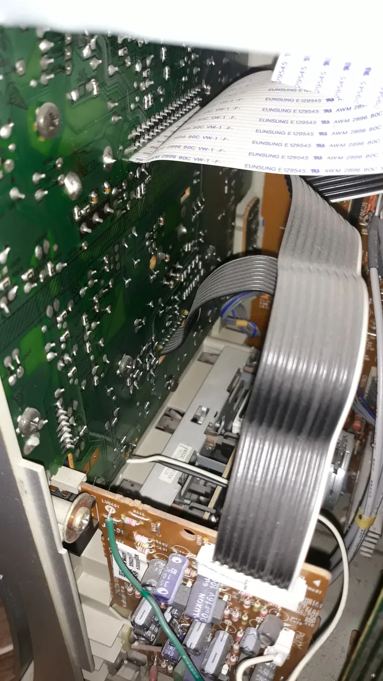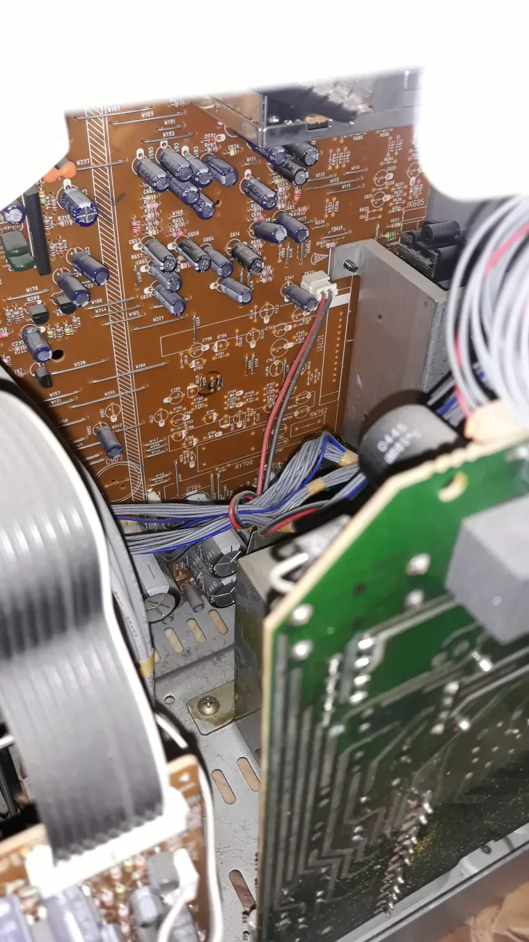 Сразу понятно, нужно лезть внутрь.... Вторая неисправность - глючит кнопки, жмешь одну, он думает, что жмешь другую. И две кнопки на следующий день вышли из строя и перестали на что либо реагировать.... И третья неисправность - сильно выгорел ваккумно-люминисцентный дисплей-индикатор, эту неисправность увы нельзя устранить без замены дисплея....сегменты неравномерно подсвечены и четыре прочерка, которые горят если не установлено время в дежурном режиме совсем выгорели от постоянного использования и еле еле светят желтым светом...