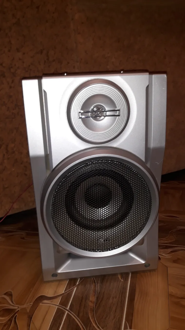 Изготовлен он в январе 2005 года. Теперь про звук, по AUX подключил к компьютеру, ну такой неплохой звук, басса мало - единственный недостаток, но если сделать погромче, то басс все таки появляется. Средние и высокие частоты звучат идеально, не режут уши. Радио этот центр ловит хорошо, тоже проверил.... В общем для использования в качестве акустики для телевизора этот центр годится отлично, караоке проверить не удалось пока что, нет микрофона... Музыку я без басса не люблю, потому для музыки по моему мнению этот центр не годится, да и соседей не помучать таким звуком, ну нету мощи, просто хороший звук....и все потому, что LG сделали неправильно фазоинвертор и короб у колонок и не поставили хороший усилитель, играющий все частоты. В общем такой вот аппарат оказался у меня.... Теперь займемся ремонтом? Разбирается центр легко, нужно выкрутить винтики, держущие большую часть корпуса и снять её. Все я сделал: