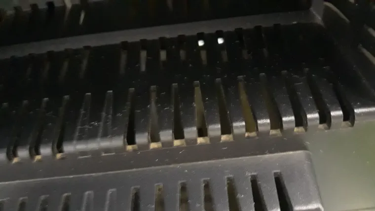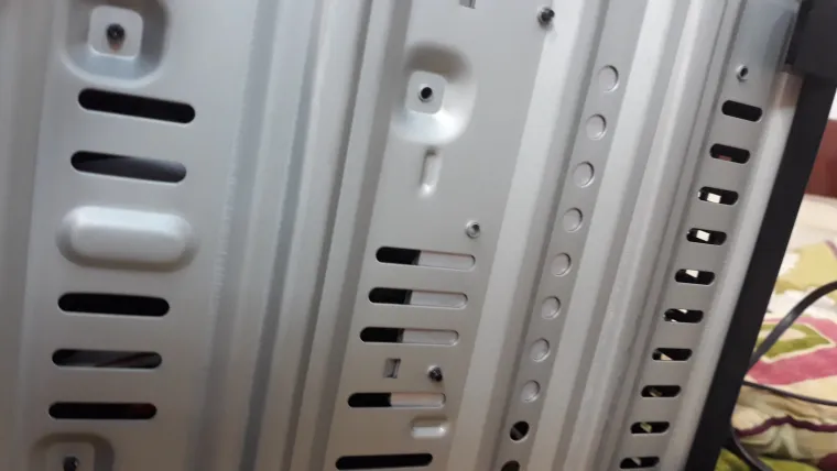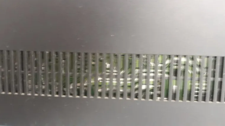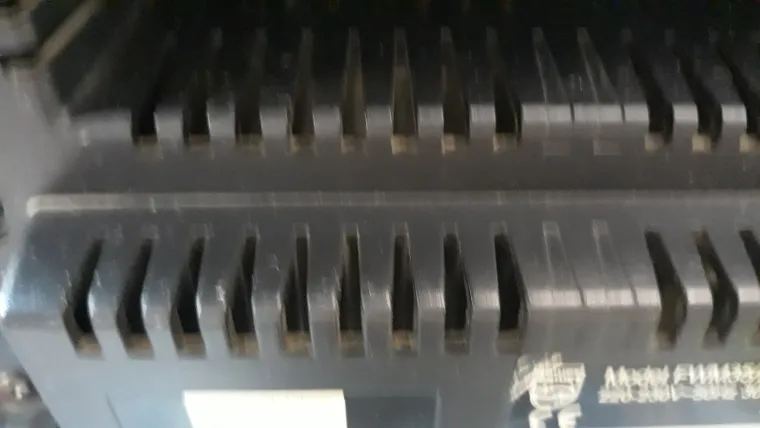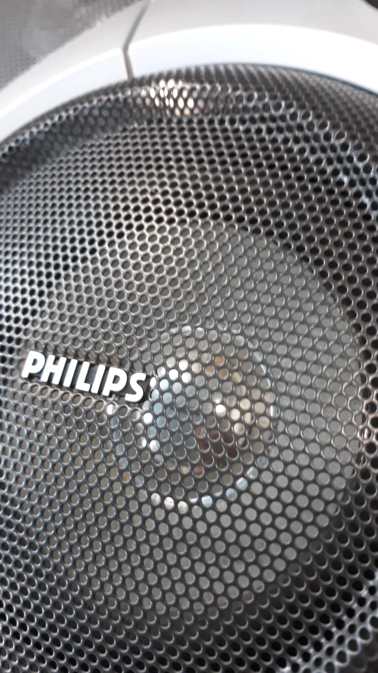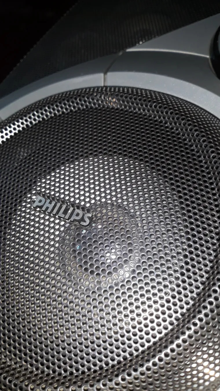Philips забыли сделать дырочки???? Нет, не забыли....это сделано, потому что в том месте где нет дырочек находится плата блока питания и логично, что 220v. Для безопасности в этом месте нету дырочек, ведь туда можно сунуть случайно что то железное и получить удар током. В верхние дырочки если заглянуть, то можно увидеть основную плату с другой стороны усилитель и массивный радиатор усилителя: