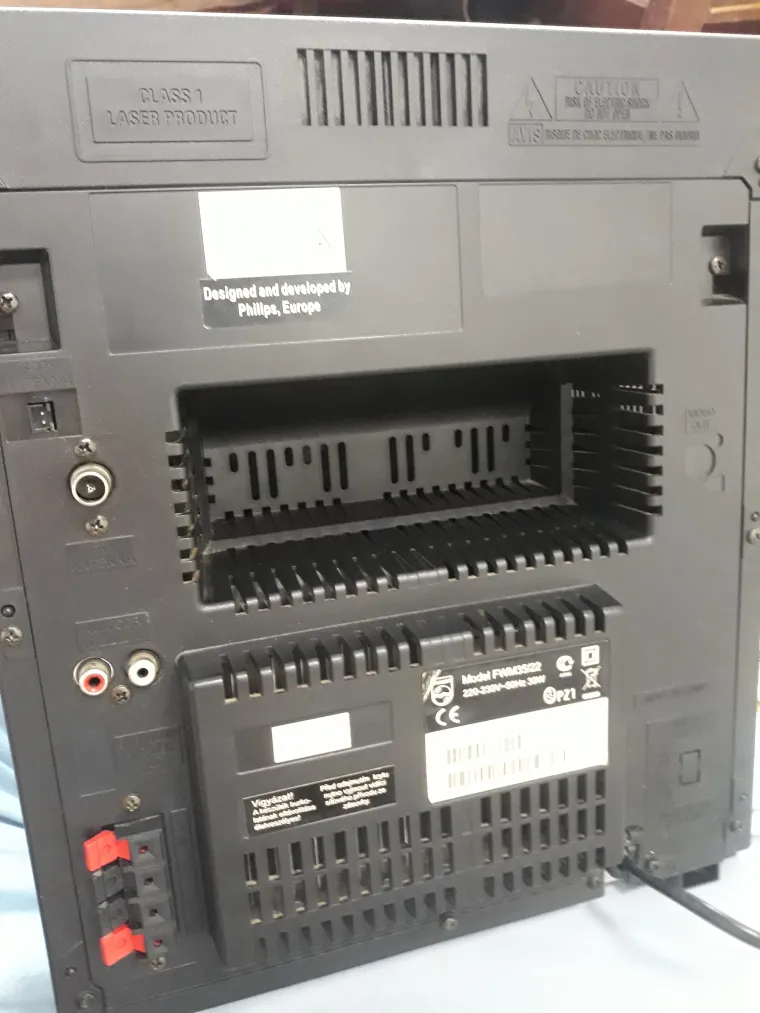 Давайте посмотрим внимательно теперь на сам музыкальный центр. Начнем с задней стенки, там находятся все входы/выходы. На ней заметно несколько наклеек и надписей.