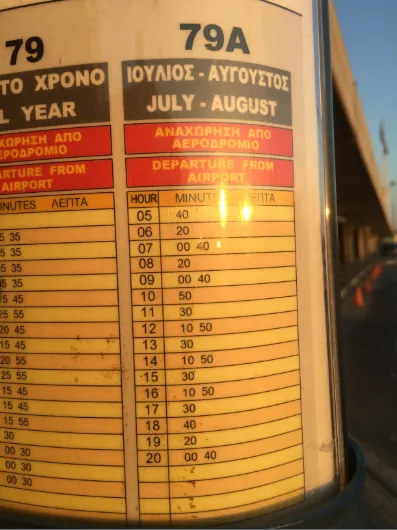 Для этого, выходим из здания аэропорта Салоники и видим перед собой автомобильную дорогу по которой ездят , в том числе, и нужные нам рейсовые автобусы. Находим остановку рейсового автобуса 79А (она почти напротив выхода из аэропорта). На столбе около остановки висит расписание нужного автобуса 79А
