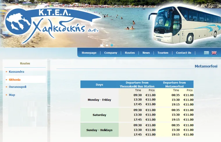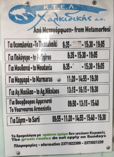 с пляжами и отличным песком на пляже – посмотрите Метаморфози, только не жалуйтесь потом, что вам было скучно . Деревушка Метаморфози отлично подходит и для длительного отдыха мамы и маленького ребенка и как “база” – отправная точка для самостоятельных путешествий по Халкидикам. И не обязательно для самостоятельных путешествий нужен автомобиль. Вполне можно поездить из Метаморфози и на автобусе . Вот расписание автобусов на остановке в Метаморфози