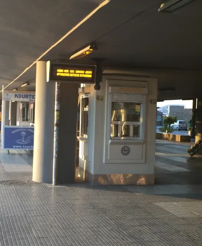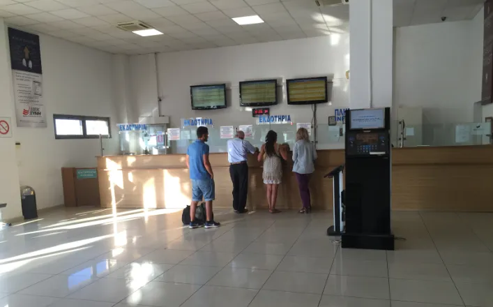 Заходим внутрь автовокзала K.T.E.L Халкидики и покупаем билет до Ситонии до Метаморфози вот у этой стойки