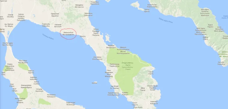 От аэропорта надо добраться до городка ( деревушки) Метаморфози на Ситонии - втором пальце трезубца Халкидики .