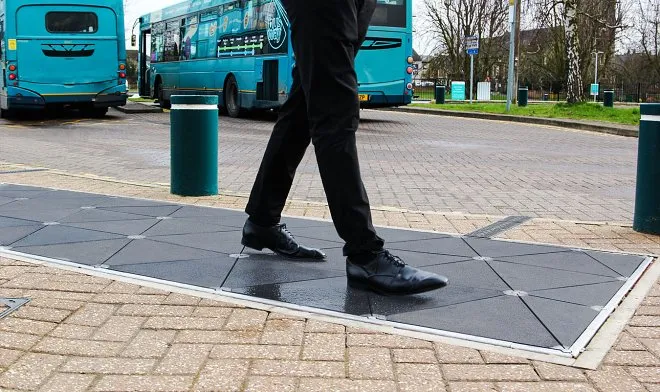 Совместный проект Совета города Бедфордширда и технологической компании Pavegen позволил реализовать проект по созданию кинетической напольной плитки. В итоге на железнодорожной станции Лейтон-Баззар (Великобритания) появились две такие дорожки с оригинальной плиткой. Под тяжестью шагов пешеходов активизируются «сжимаемые» электромагнитные генераторы. Они вырабатывают до 4 Дж электроэнергии на шаг. Такое питание обеспечивает электричеством две скамьи с USB-разъемами, чтобы подзаряжать гаджеты и цифровой экран с отображением количества генерируемой энергии. Министерство транспорта Великобритании профинансировало проект на 22,9 миллиона фунтов в рамках программы ADEPT SMART.