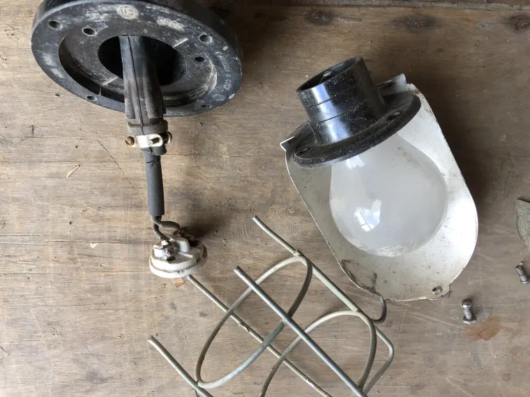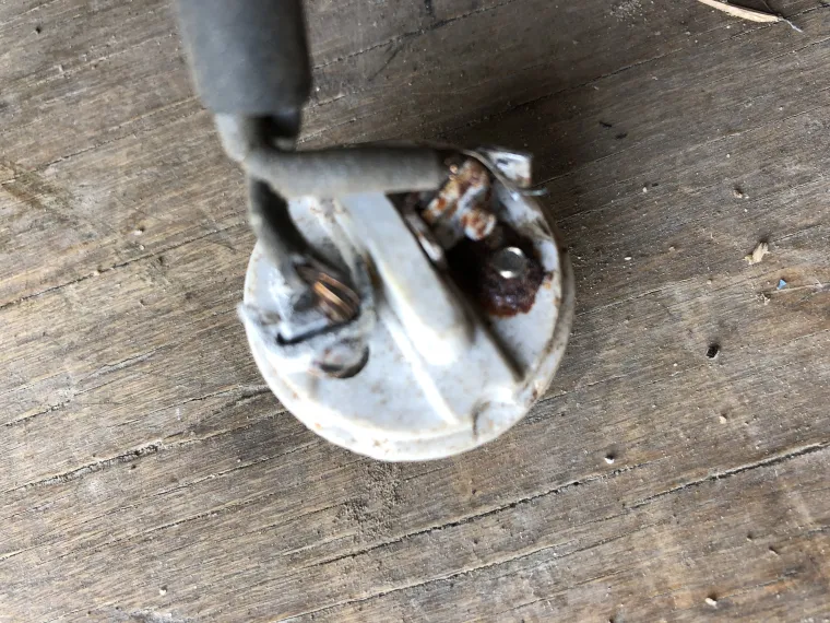 Все проржавело и требует либо аккуратной и длительной чистки старого, либо замены на подходящий керамический элемент из нового патрона. Я не стал чинить старые контакты, поменял керамику полностью на новую. Минутное дело. Поменял лампу, собрал светильник , что тоже не составило труда.