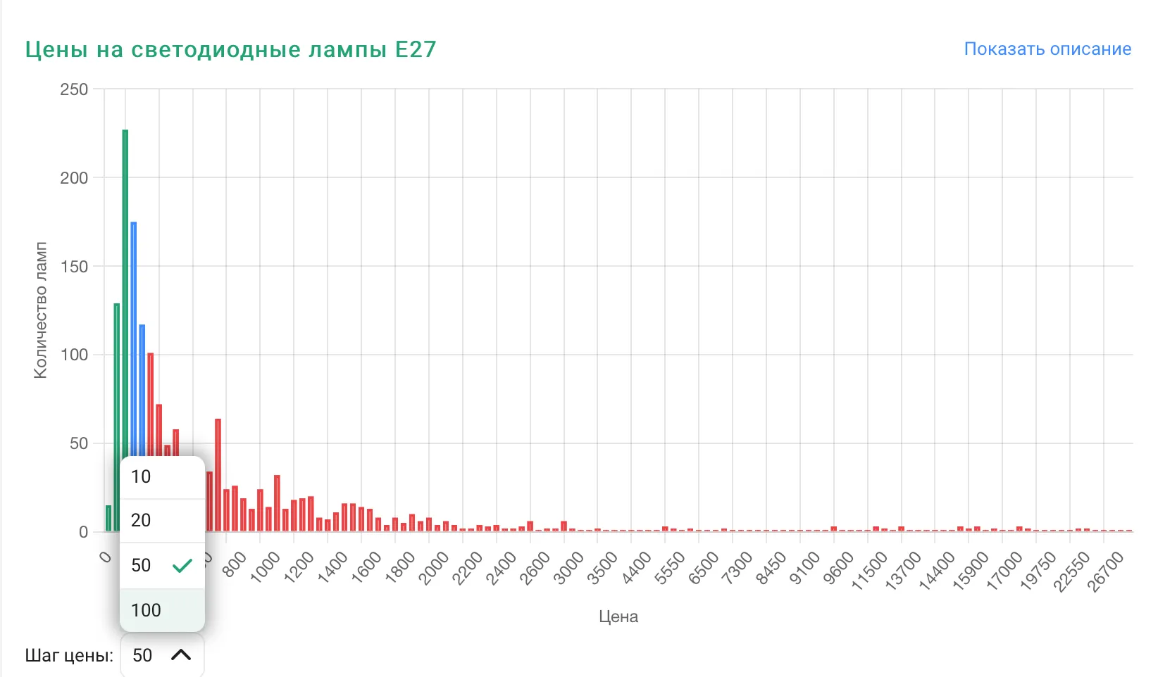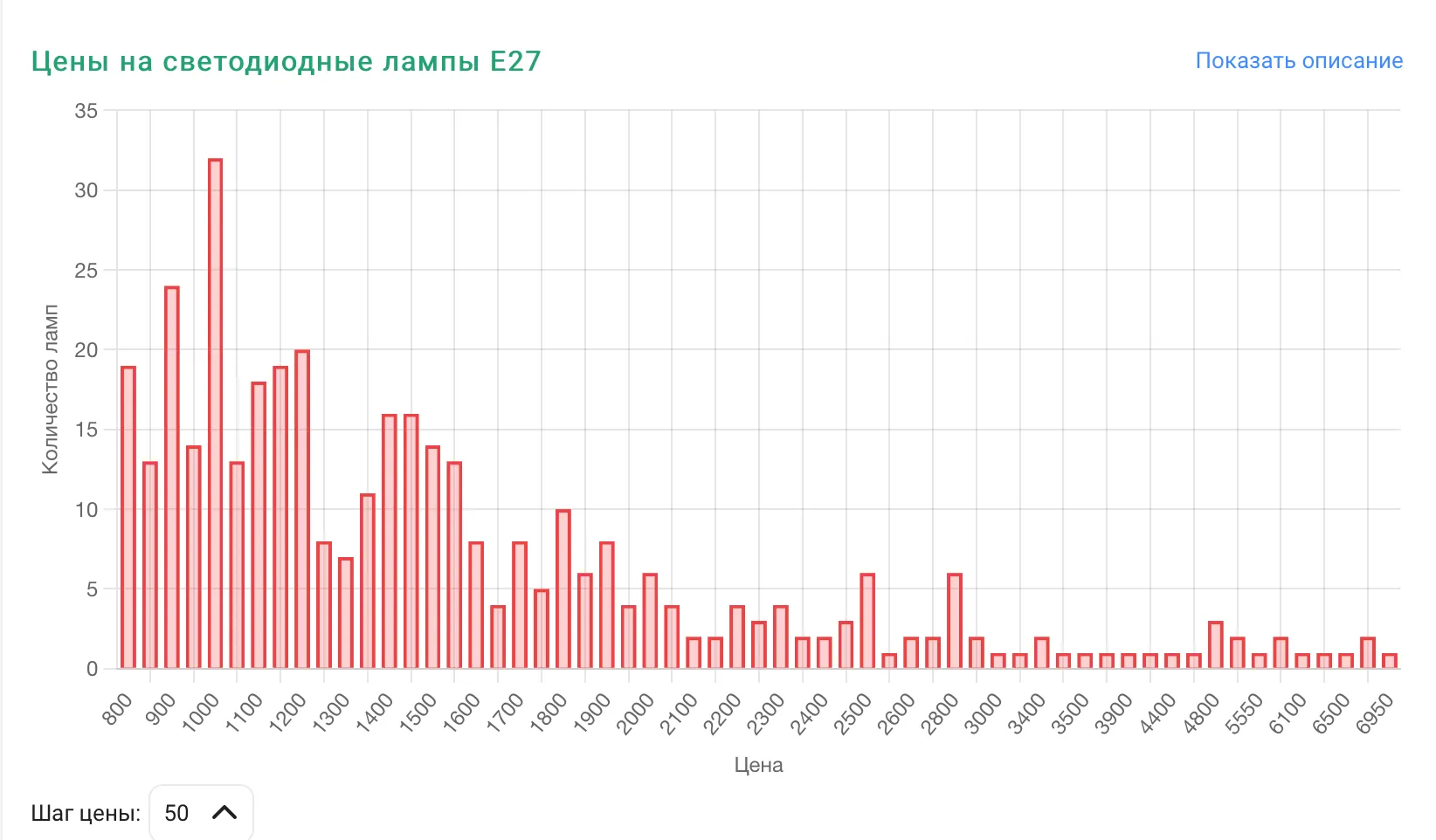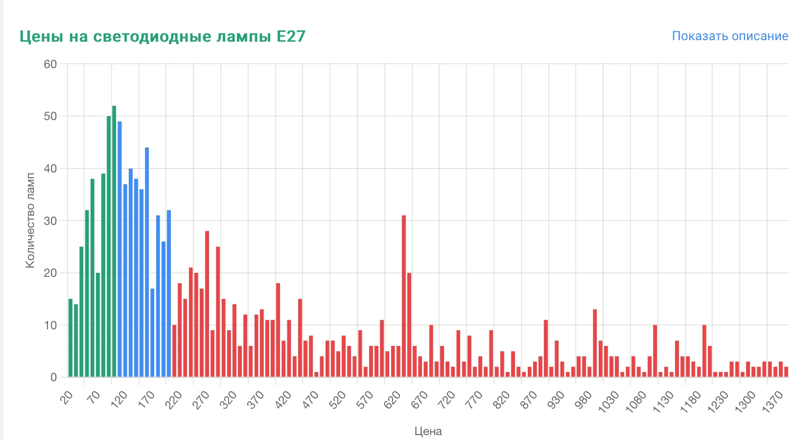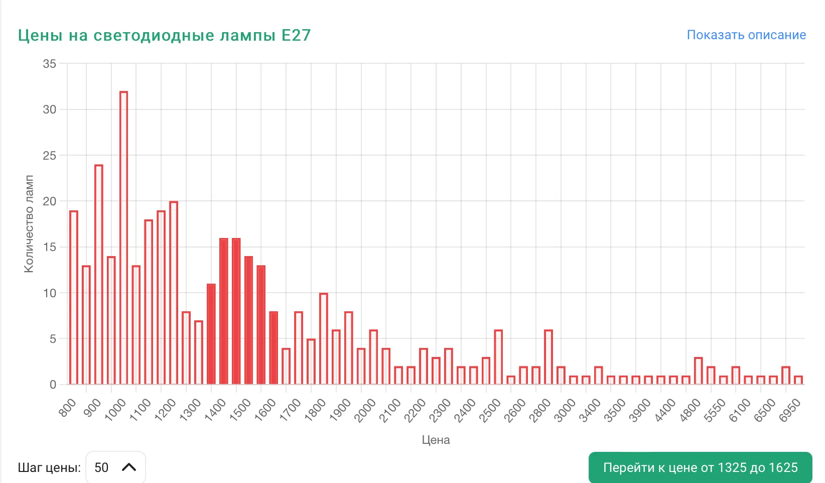 Это сделано чтобы можно было удобнее искать ценовые артефакты. Используя данную диаграмму можно выделить интересующую цену или диапазон и отфильтровать по ней рейтинги ламп.