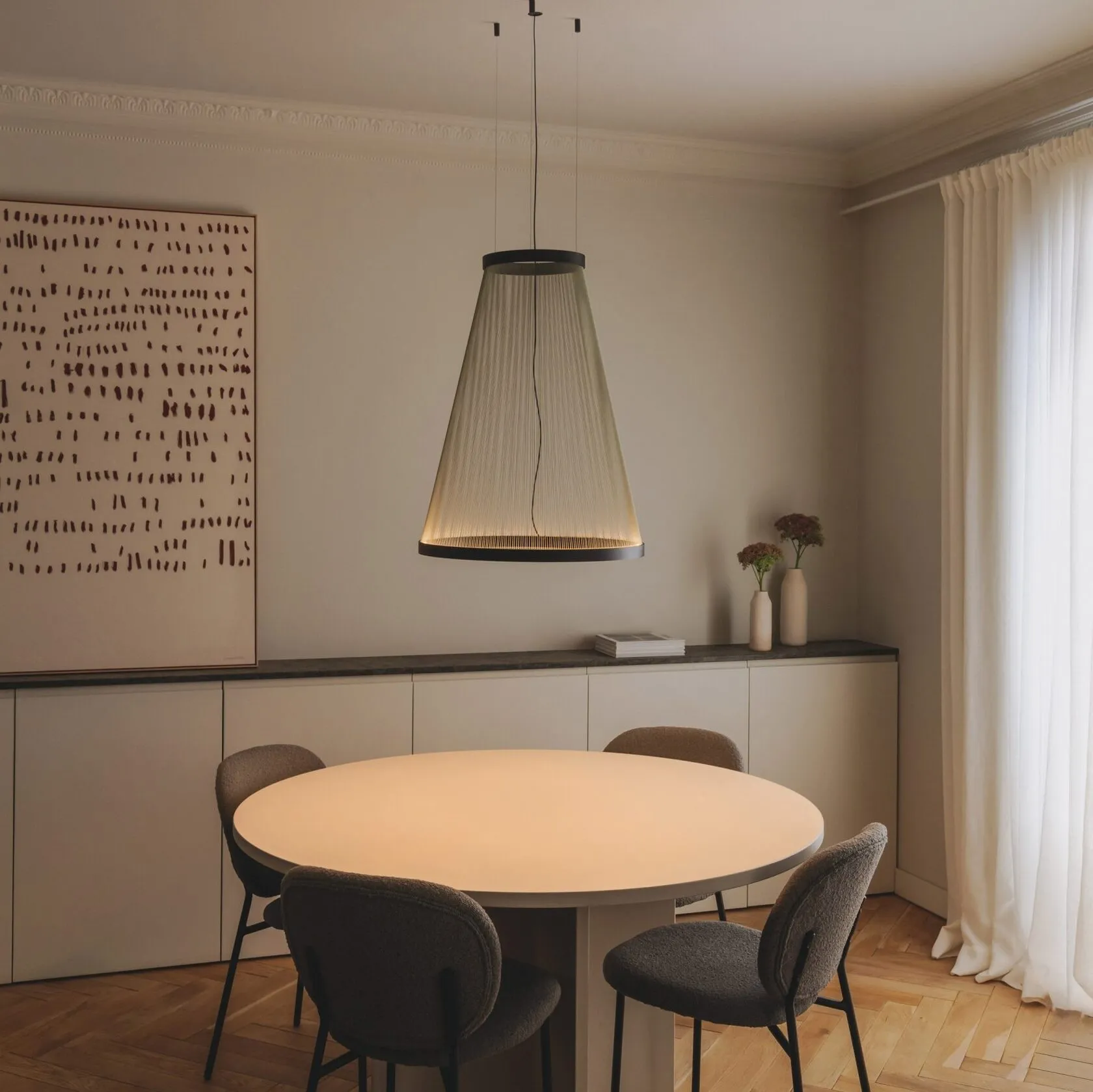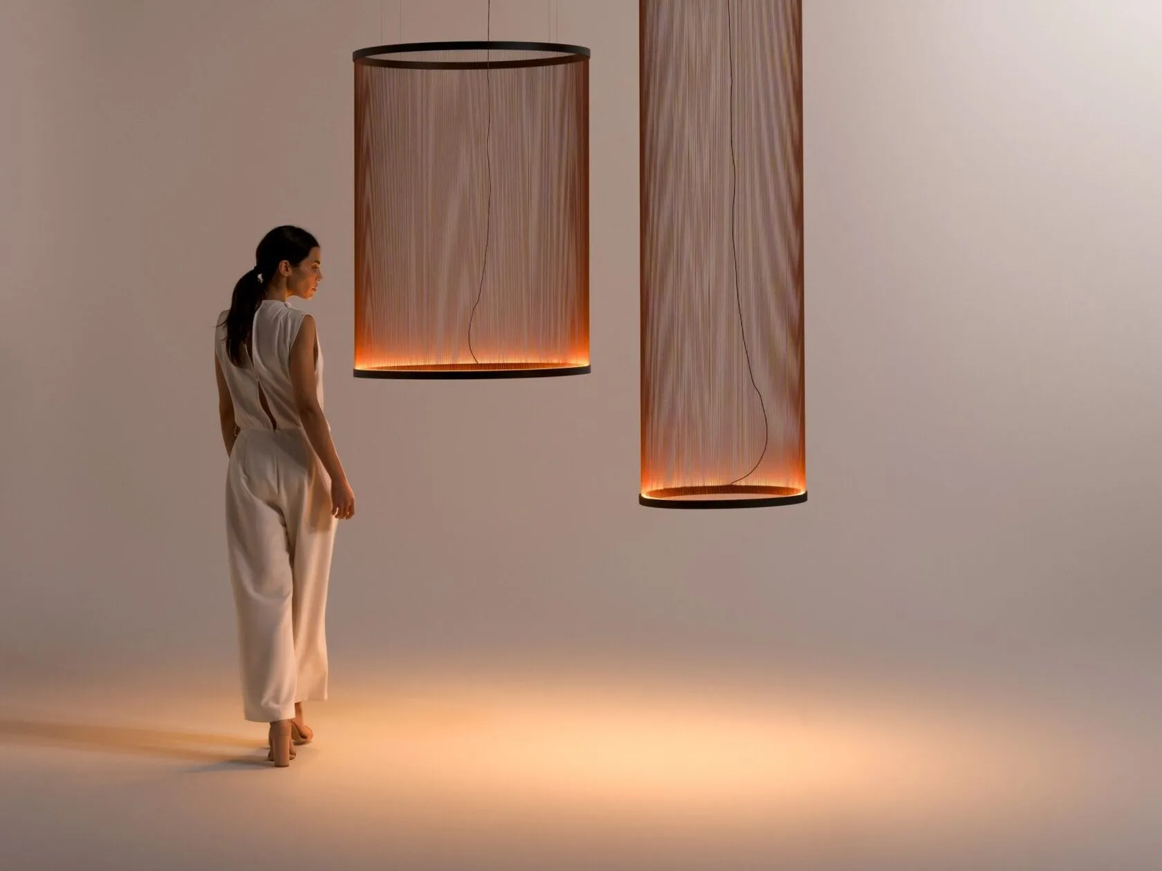 Коллекция Array была создана совместно с британским дизайнером Yamac. Особенность их творения – применение тонких нитей, которые плотно натянуты между двумя кольцами из алюминия. Мягкий свет исходит от нижнего кольца, где образуется эффект градиента, когда он распространяется вверх по нитям структуры. Дизайнер Умут Ямак участвовал в создании коллекции Array, благодаря чему получились модели светильников в форме конуса и цилиндра. При этом можно выбрать вариант расцветки и размера из 3-х имеющихся моделей. Самый большой светильник имеет высоту в 2 метра.