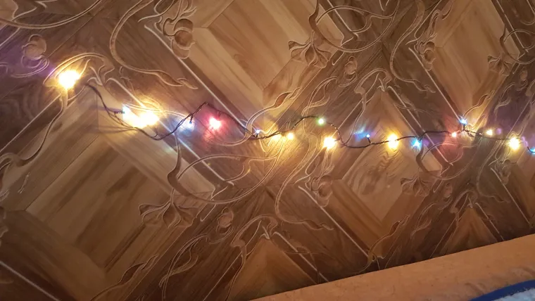 Вот такая маленькая и нежная гирлянда, вроде и аккуратная. По ощущениям - развалится от легкого воздействия. Но держится. ОК!