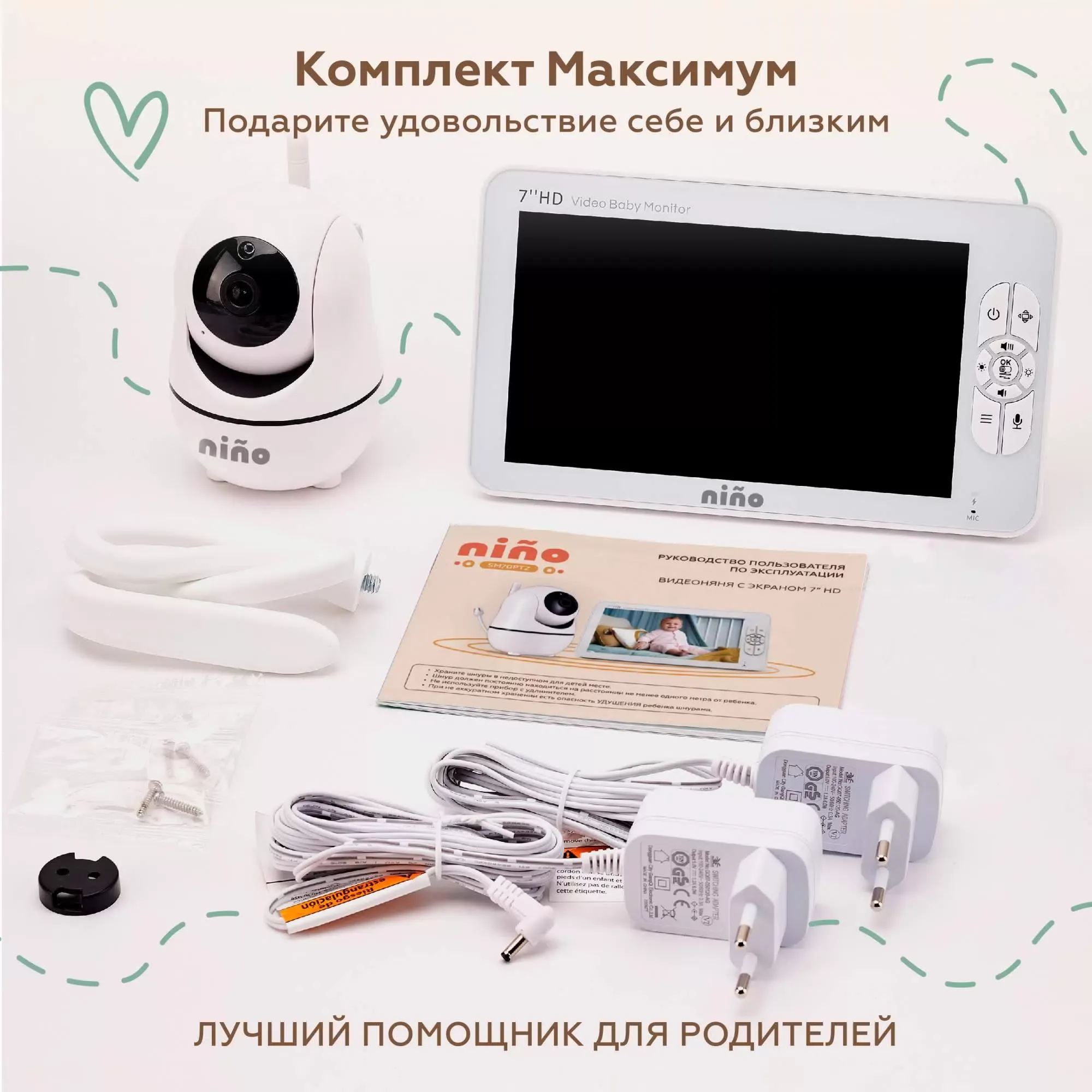Монтаж и установка: камера имеет широкое основание-подставку, благодаря которой ее можно просто ставить на горизонтальную поверхность (тумбочку, полку). Также в комплекте предусмотрен крепеж (шурупы и дюбели) для настенного монтажа – на дне камеры есть отверстия под крепление. Дополнительно камера оснащена шарнирным соединением с основанием, позволяющим наклонять вручную или фиксировать нужный угол наклона. Некоторые продавцы заявляют о “гибком креплении” или клипсе для коляски, однако в стандартном комплекте Nino 7″ HD такого спец-крепления нет – обычно это либо маркетинговый ход, либо имеется в виду, что камеру при желании можно закрепить на кронштейне/клипсе (приобретенном отдельно). Тем не менее, сама камера компактна и легко впишется в интерьер детской, ее можно переносить при необходимости.