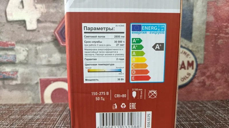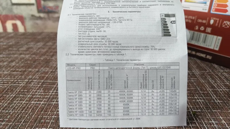 В коробке лампа и инструкция. На торце лампы размещены краткие технические характеристики. Лампа разделена на две части, верхняя полуматовая.