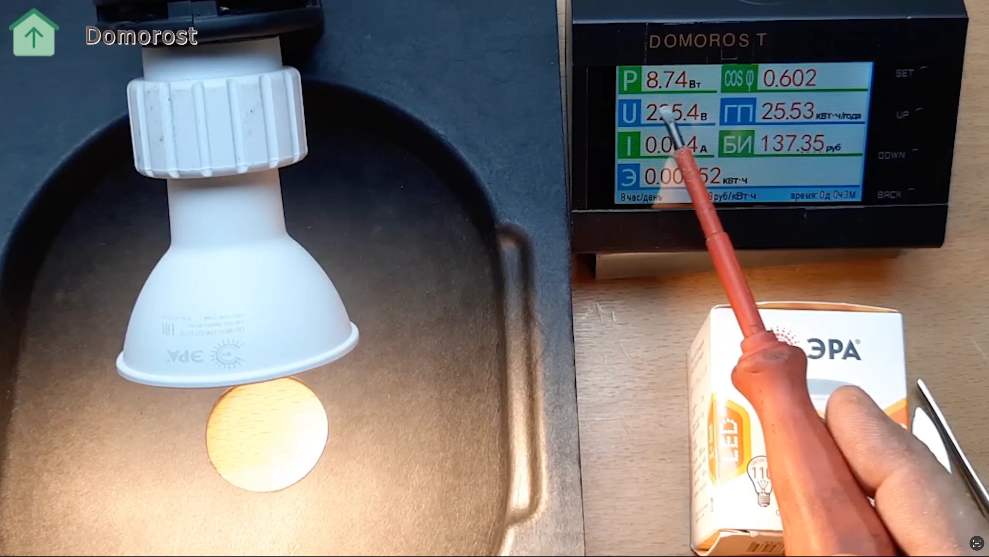 Коэффициент мощности — стабильно 0,6. Для бытового света приемлемо, но без восторгов. При 8 часах работы в день годовой расход энергии обойдется в 13,7 рубля (по тарифу 5,38₽/кВт·ч). Мелочь, а приятно.