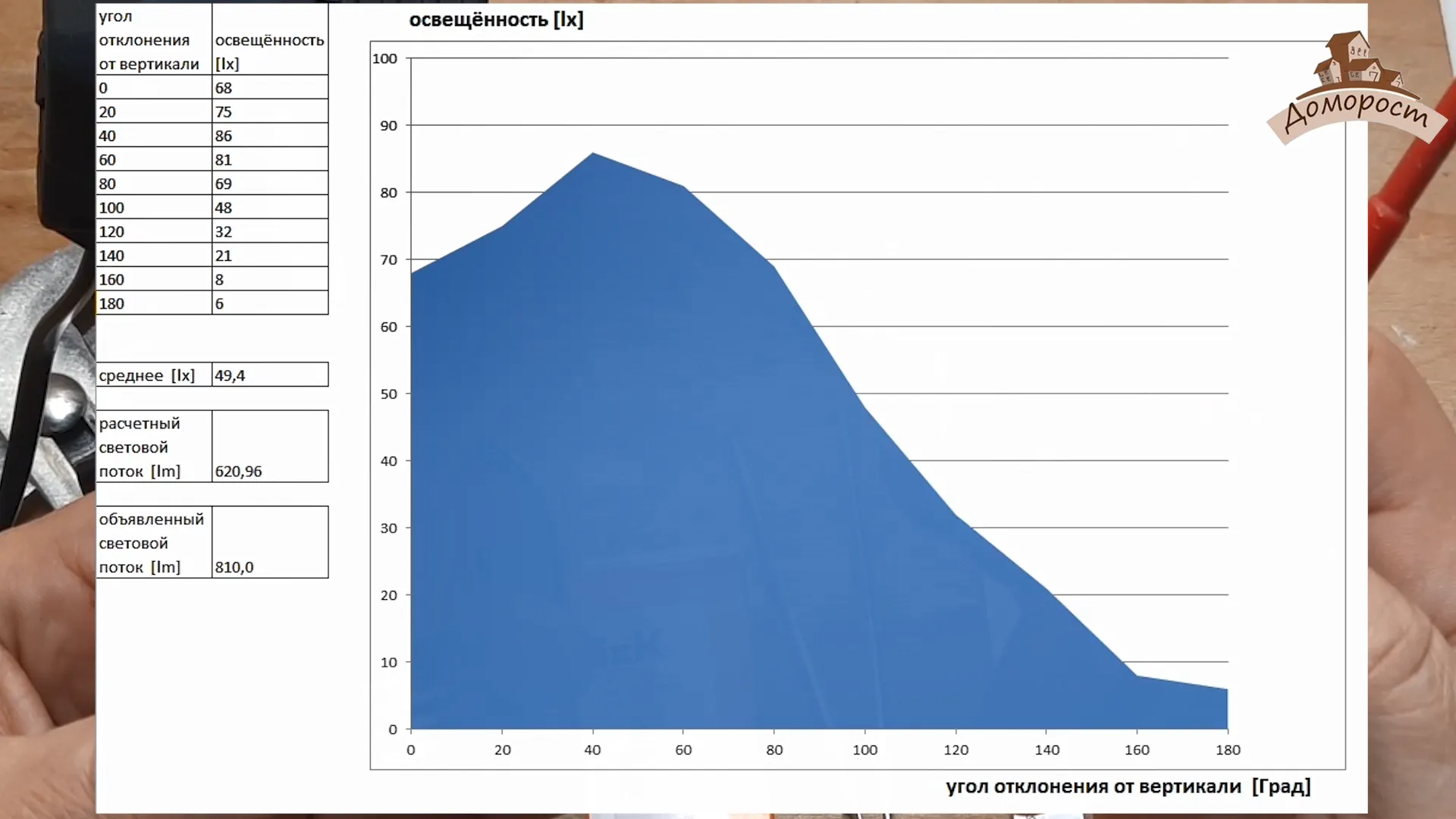 Снимаю диаграмму освещенности. В моем случае освещенность получилась равной 620 Люмен, в то время как IEK заявляет 810 Люмен.