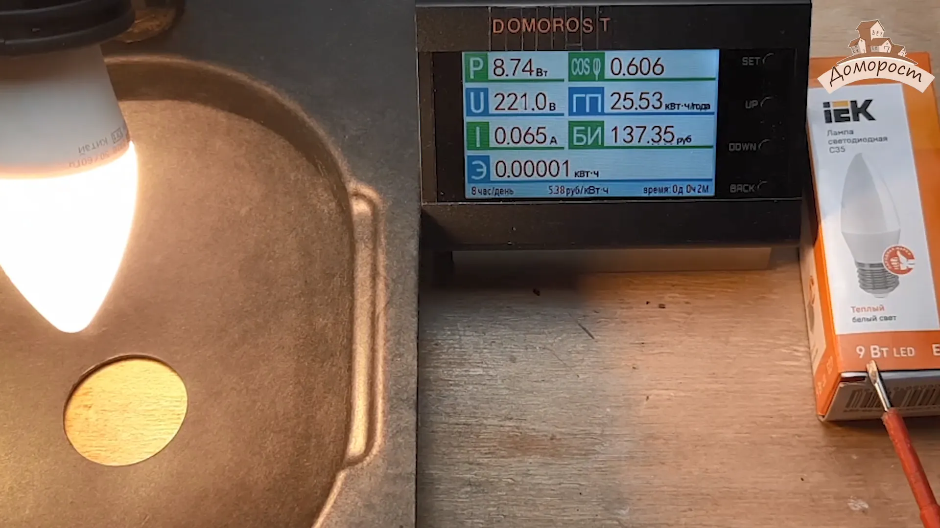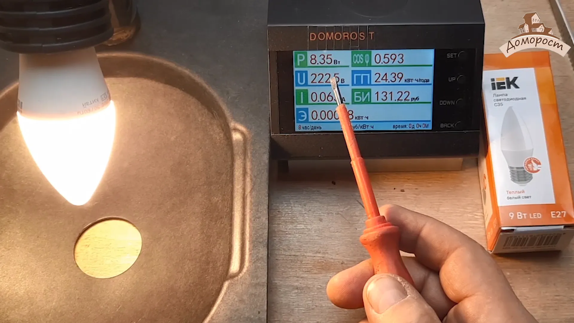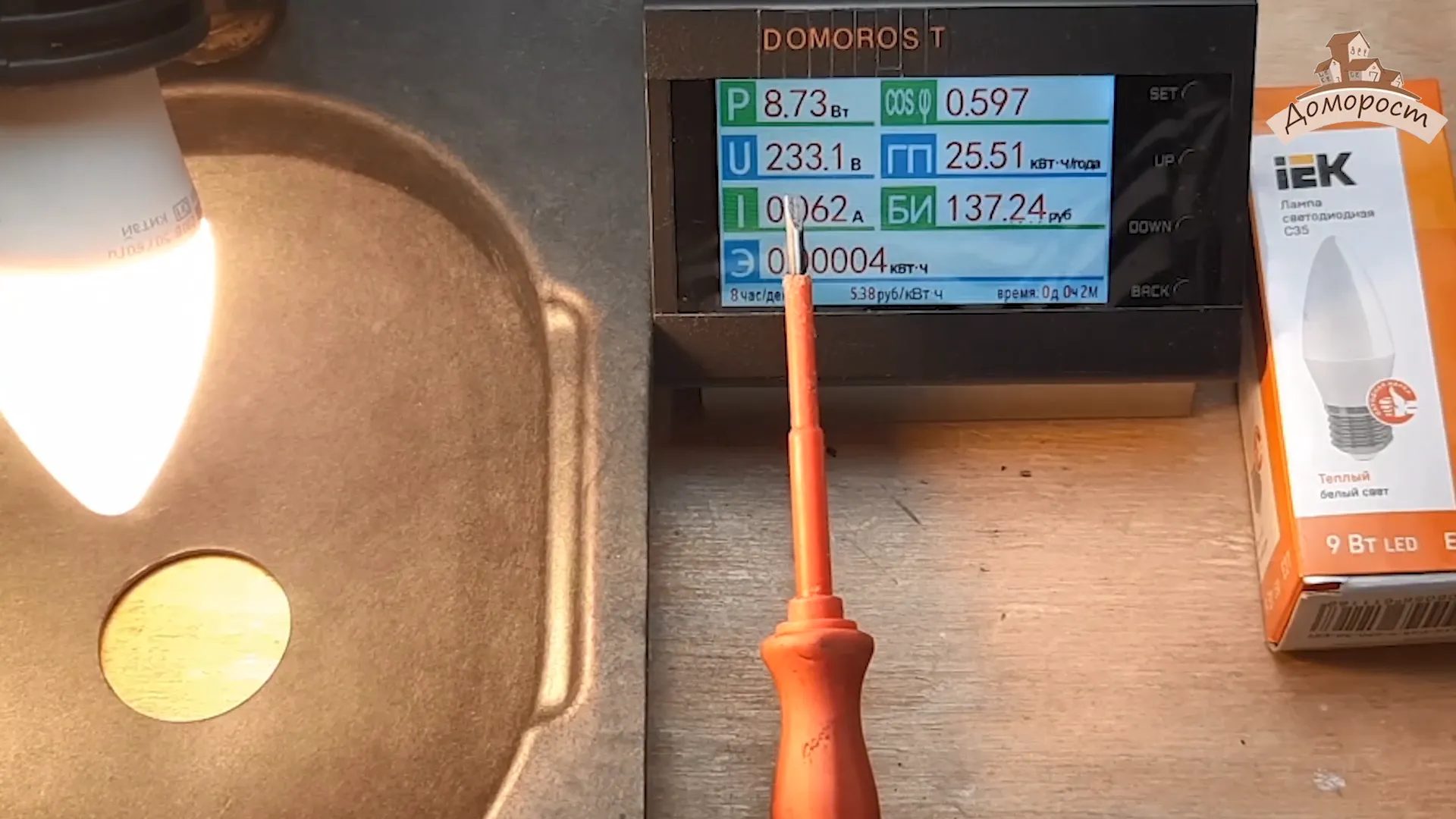 Лампа — свечка, форма достаточно привычная. Что же, давайте традиционно начнем с измерения реальной мощности лампы.