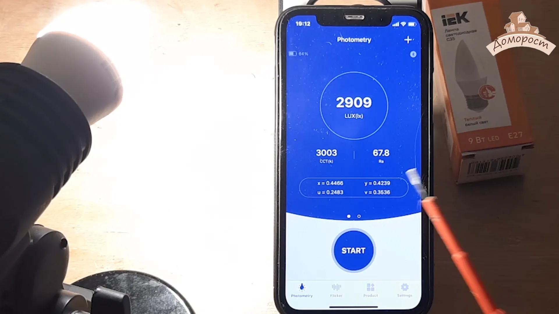 Настало время измерить количество света от светодиодной лампочки IEK. Лампа в метре над поверхностью стола, перпендикулярно ей находится Люксметр.