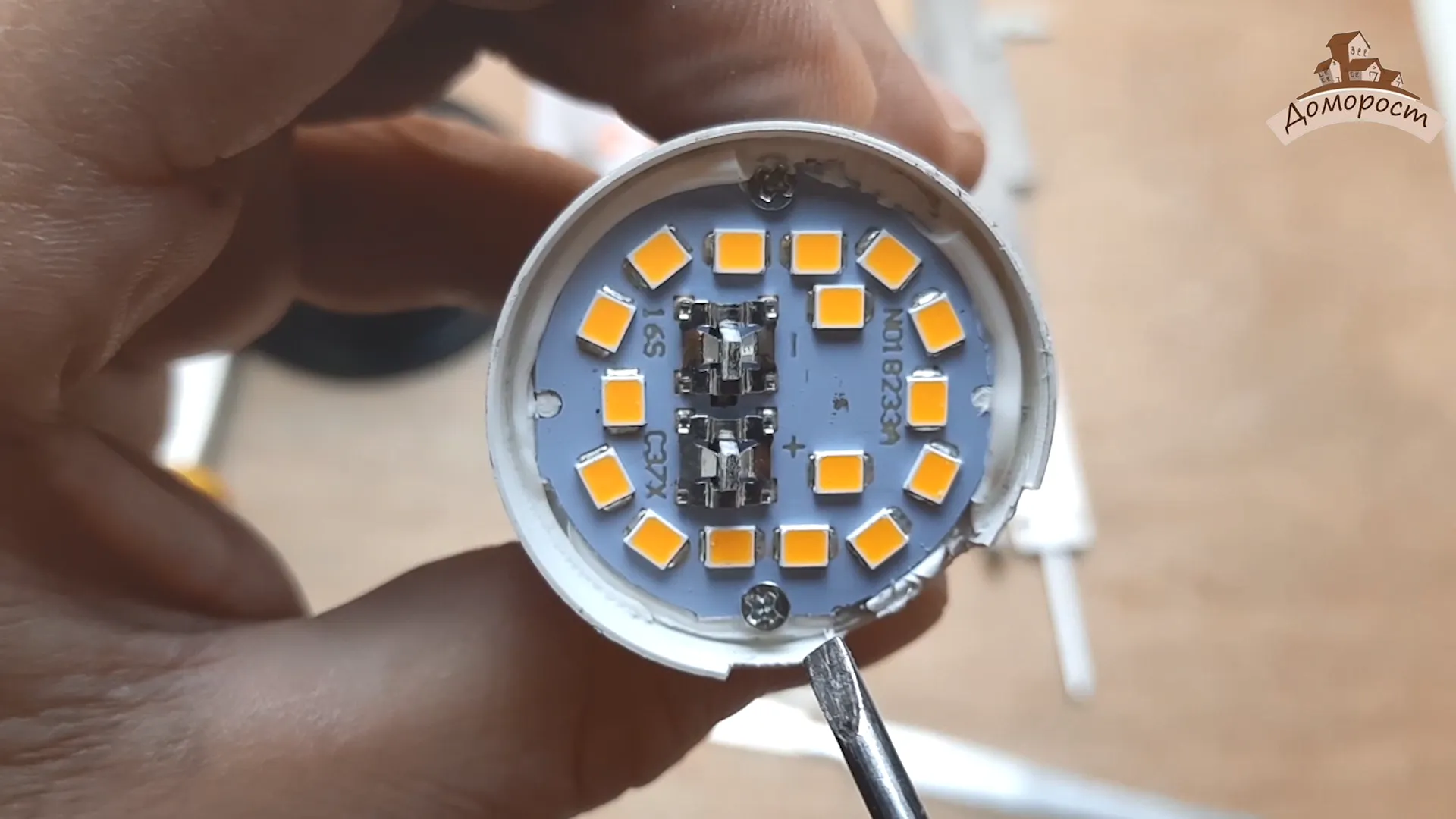 Под рассеивателем нас ждет диодная плата с 16ю корпусами светодиодов. Внутри каждого корпуса угадывается всего один кристалл светодиода. Все корпуса соединены последовательно.