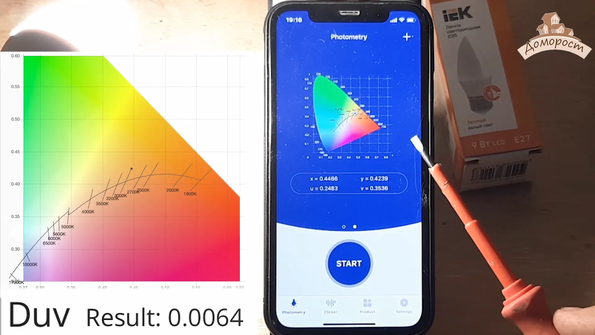Перейдем к измерению характеристик качества света. Прежде всего цветовая температура — 3 000К, индекс цветопередачи Ra — всего лишь 68.