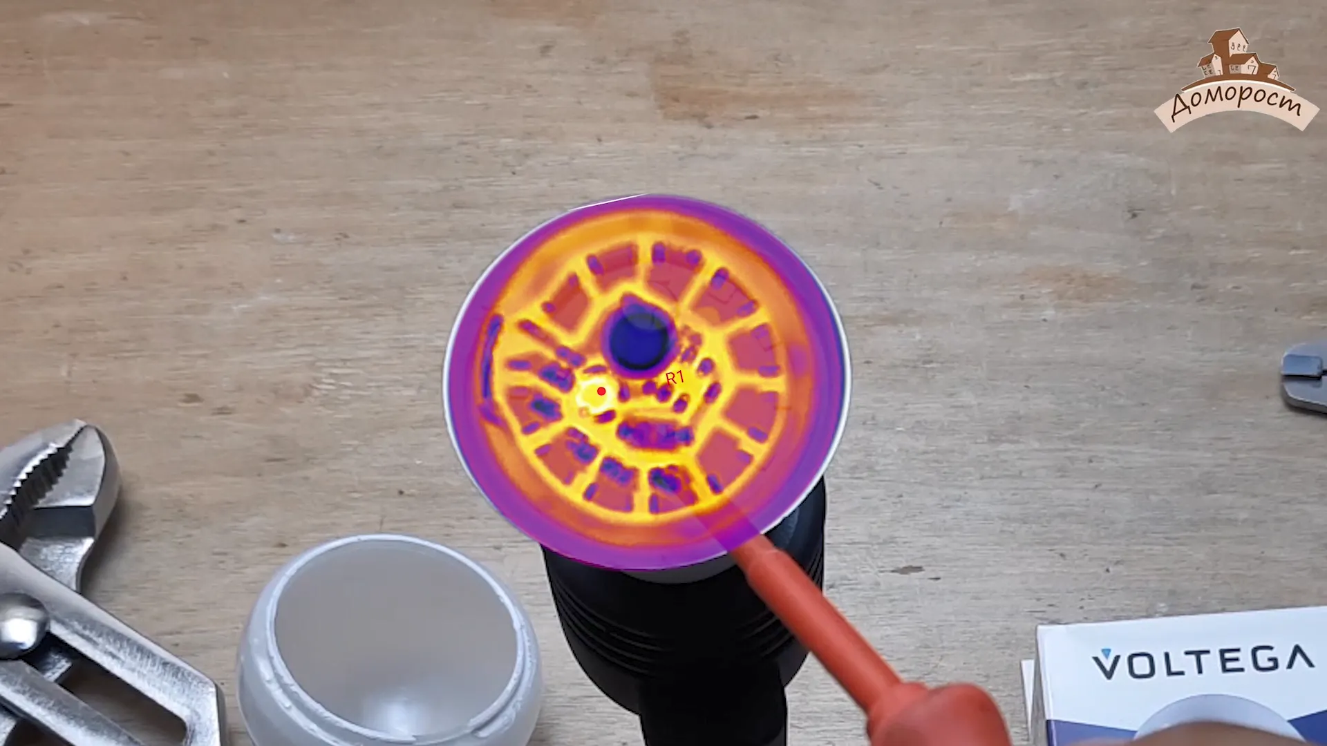При помощи тепловизора нахожу точку максимального нагрева на диодной плате и, установив в эту точку термопару, измерить температуру диодной платы со снятым рассеивателем.