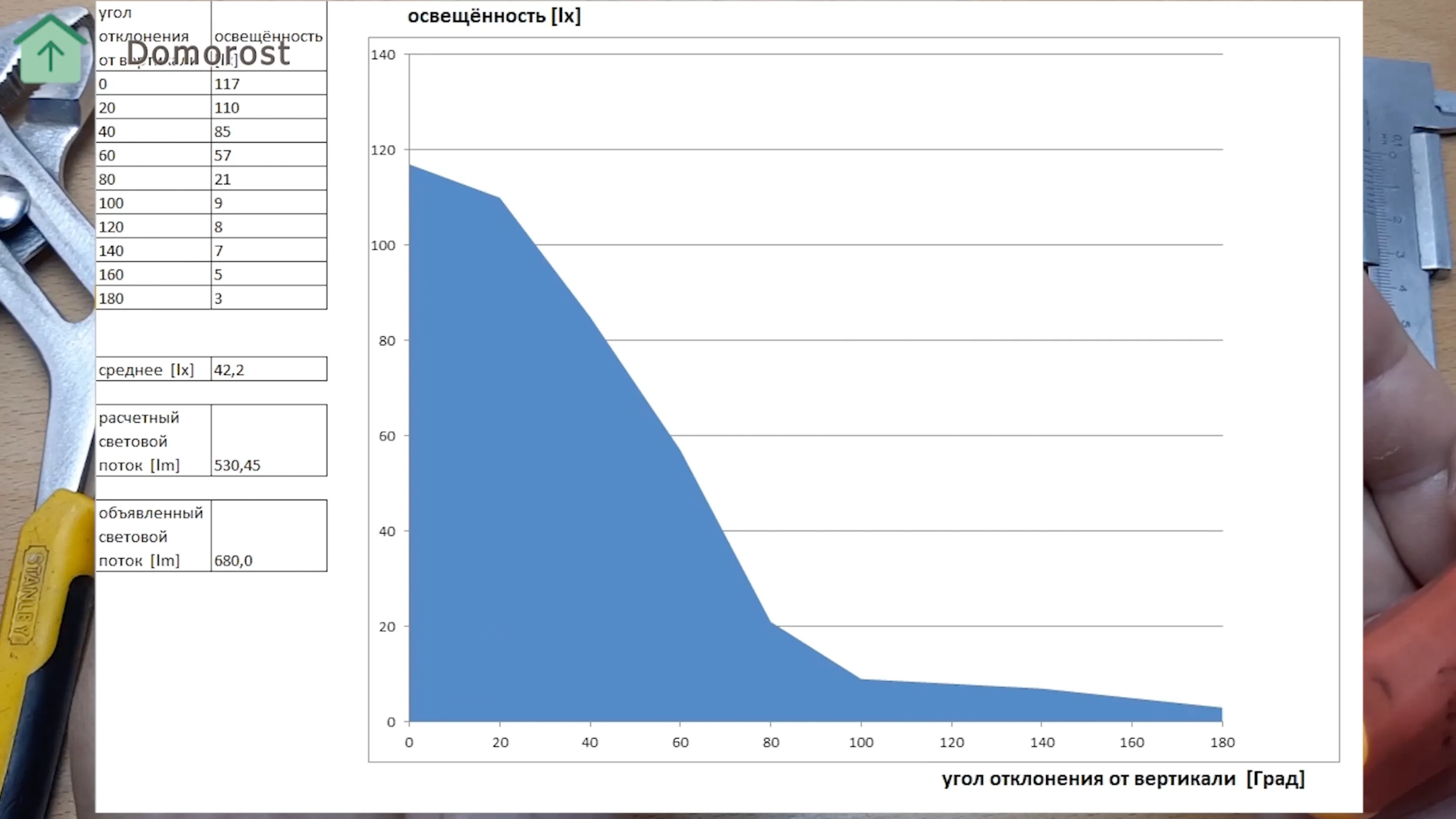 Теперь же рассмотрим диаграмму освещенности, которую я построил по 10 точкам в темной камере. Световой поток который вышел у меня - 530 Люмен, в то время как производитель заявляет 680 Люмен.