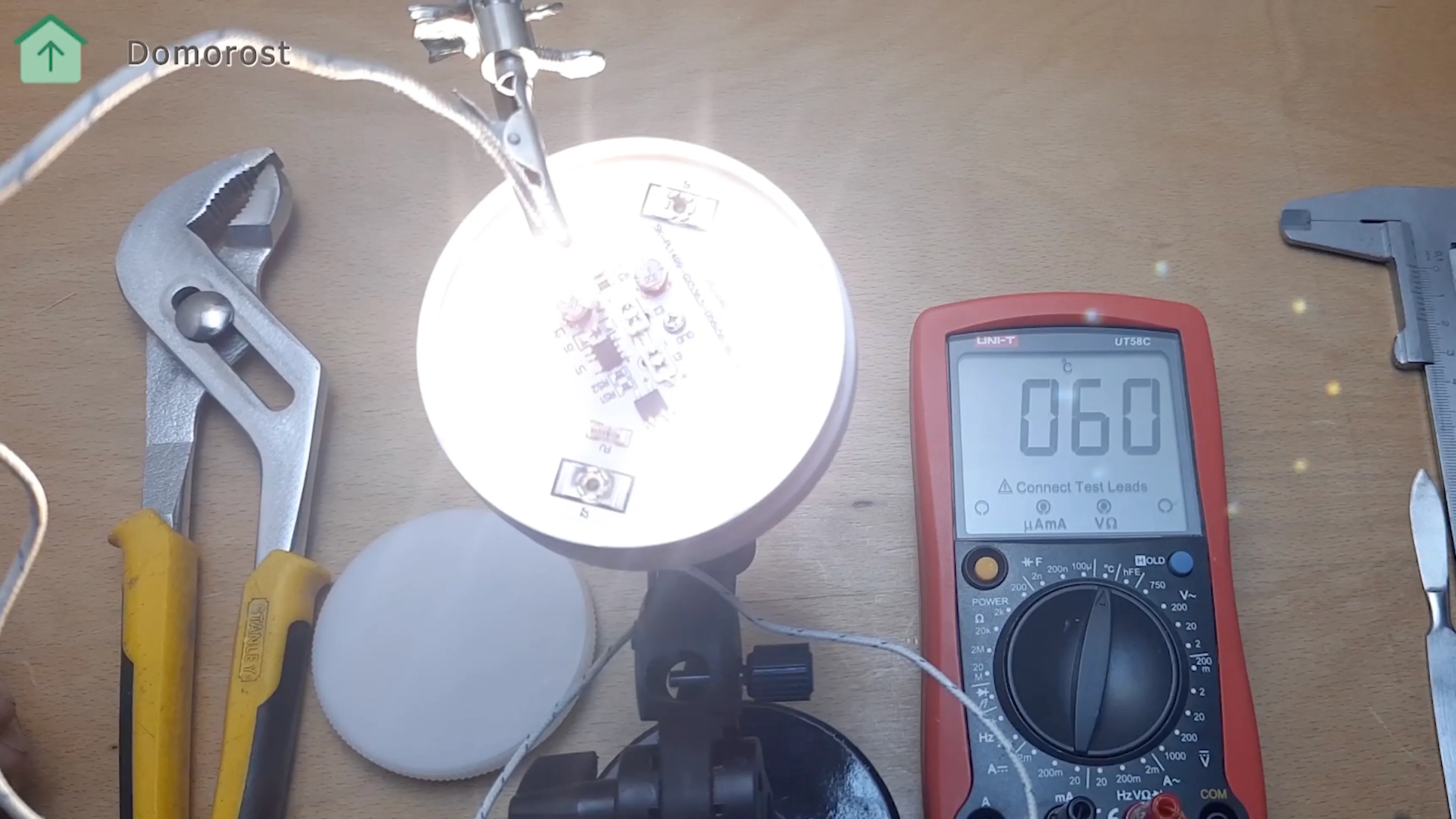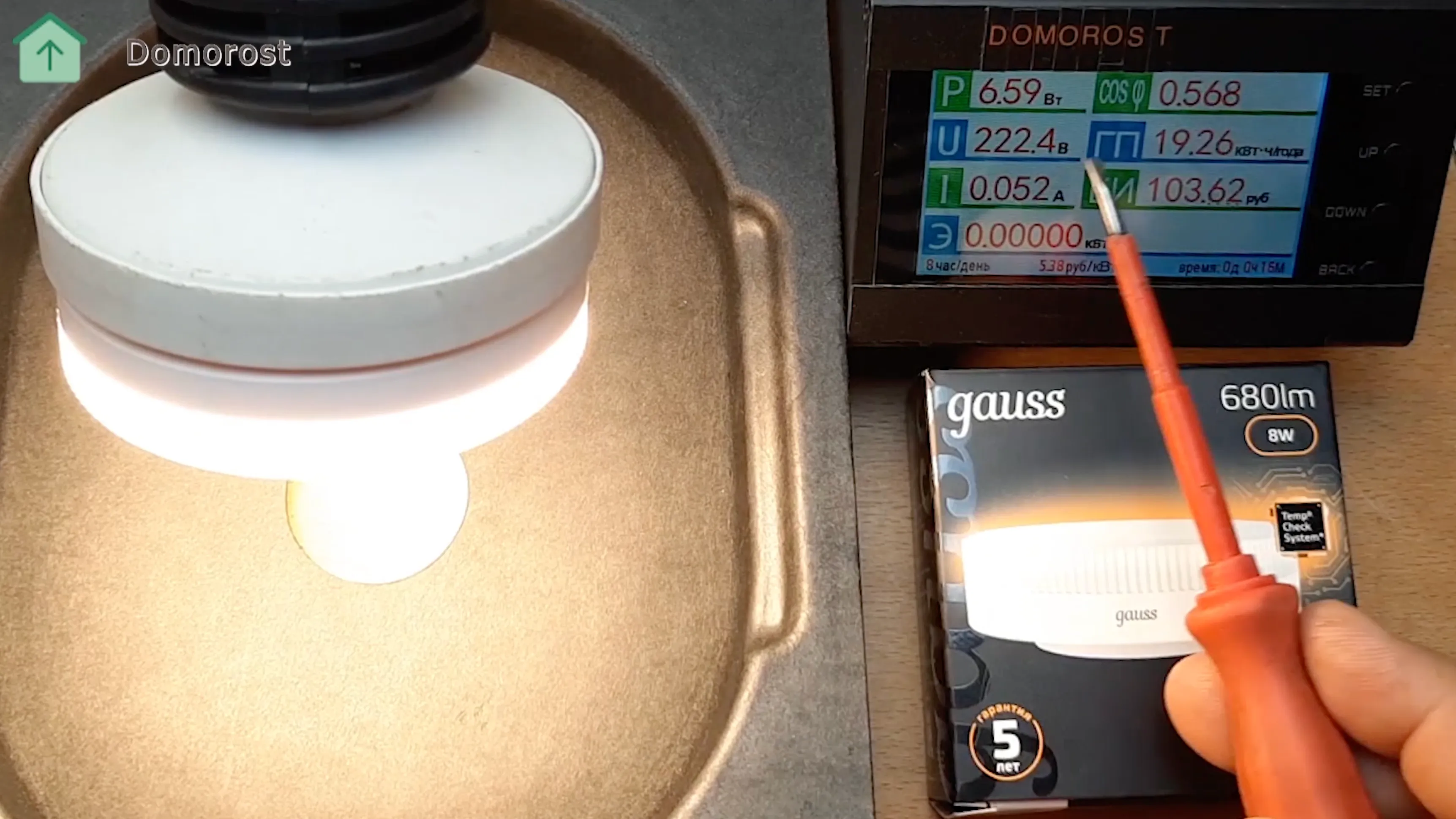 При первом же включении лампа выдает 6,5 Вт при напряжении в 220 Вольт. Да, не очень похожа мощность на заявленную. Стандартные 20%.